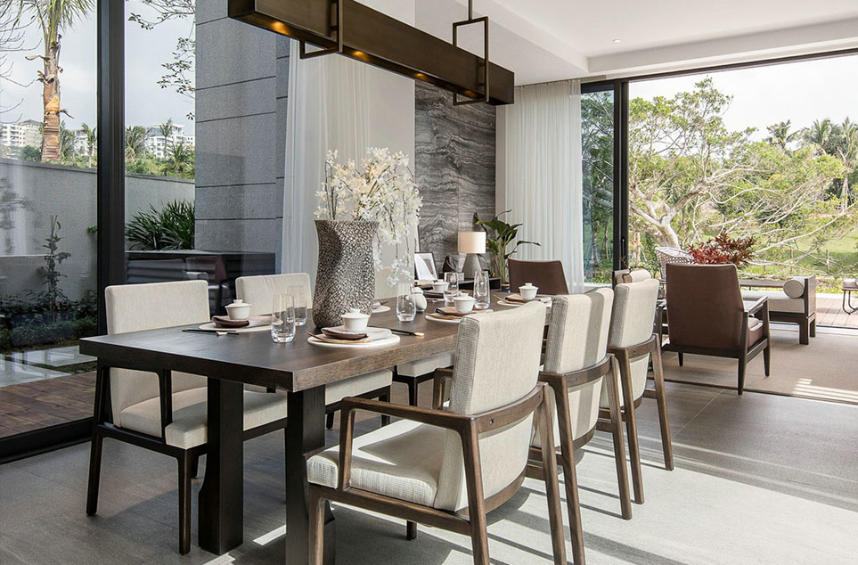 柔软的沙发与岩板圆茶桌增添了几分时尚的轻奢格调,眺望室外花园美景,体验别样的闲适