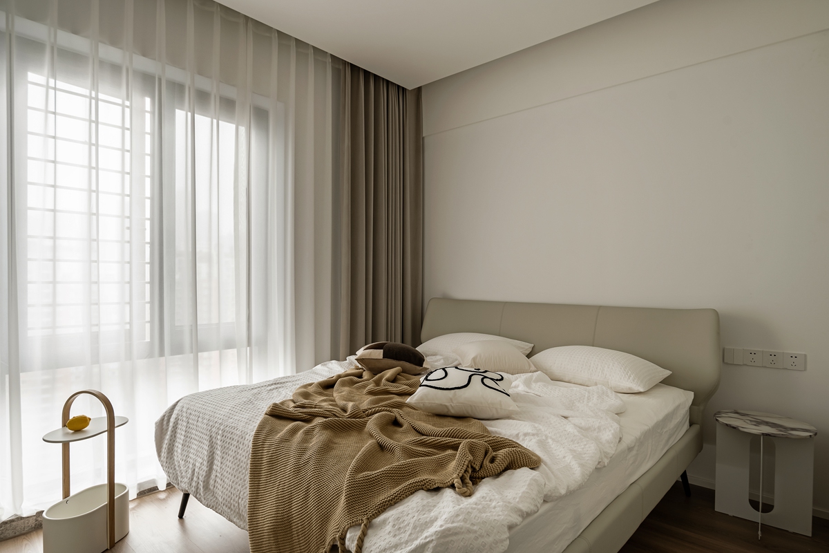 浅灰床头与棉麻床品,在光影中晕出慵懒质感;棕色针织毯的肌理,为空间增添触觉温度。床边小几的大理石纹理与极简造型,让“休憩”也成为兼具美学与舒适的体验,每一个清晨与夜晚,都在此被温柔接住。