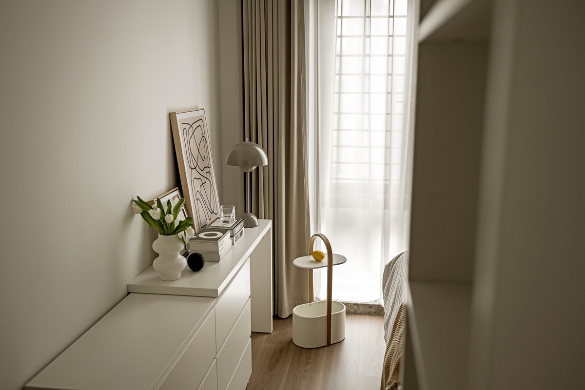 米杏色沙发如同被阳光晒暖的软云,搭配几何感黑白地毯,让空间在柔和中透出利落。白色护墙板以极简线条勾勒秩序,透光纱帘滤过的光线,让整个客厅成为“可呼吸”的松弛容器,静坐于此,便能感知时光的慢淌。