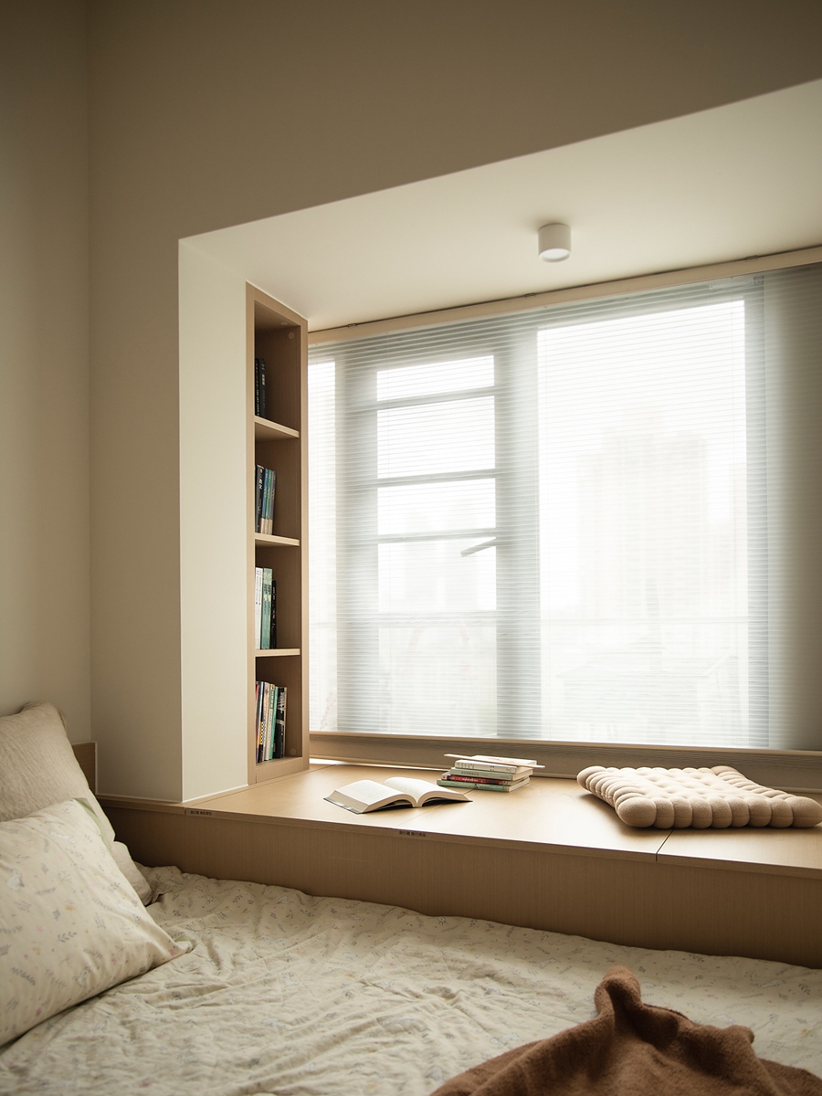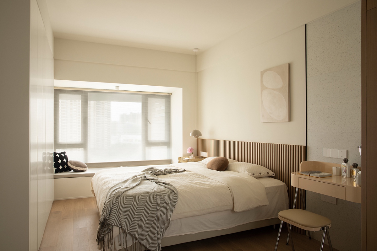 木质百叶床头呼应浅木色地板,柔光吊灯与窗畔飘窗营造静谧氛围,大面积柜体满足收纳需求,每一晚都在“简洁无冗余”的舒适感中,坠入深度安眠。