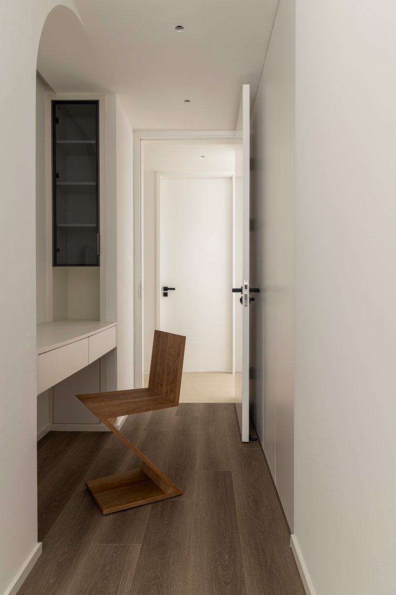 无冗余装饰的睡眠空间,以一体化柜体实现收纳与美学的统一,玻璃柜门若隐若现的层次,让极简不再单调;阳光落在肌理感床品上,整个房间都弥漫着“卸下所有纷扰,只与宁静相拥”的治愈力。