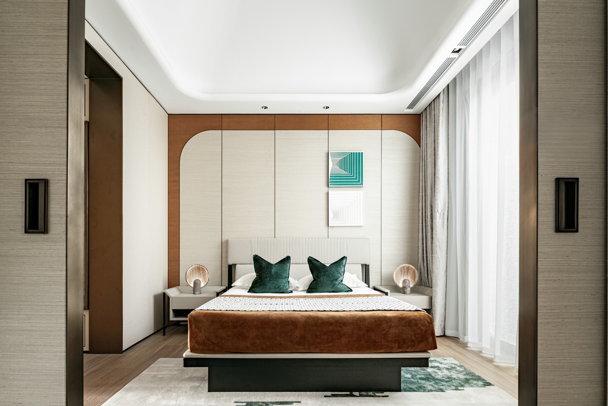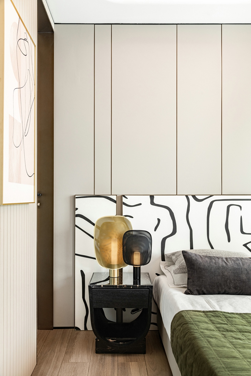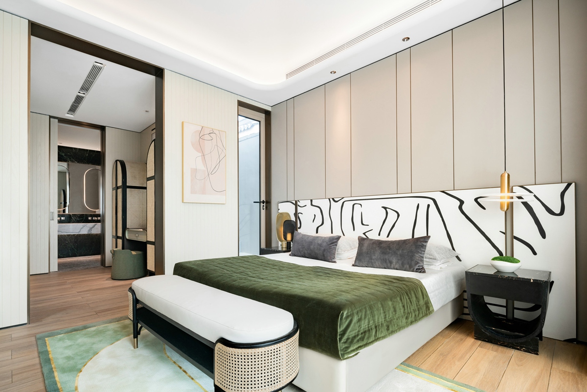 床头背景的抽象线条如黑胶唱片的纹路,将艺术张力延伸至休憩空间。墨绿绒面床品如森林暮色,包裹住床榻的柔软;藤编床尾凳的自然肌理,与金属灯具的冷光相映成趣,而通向卫浴间的动线里,大理石与木质的材质对话仍在延续——当野性设计遇见温柔触感,睡眠便成了与艺术共眠的奢享。