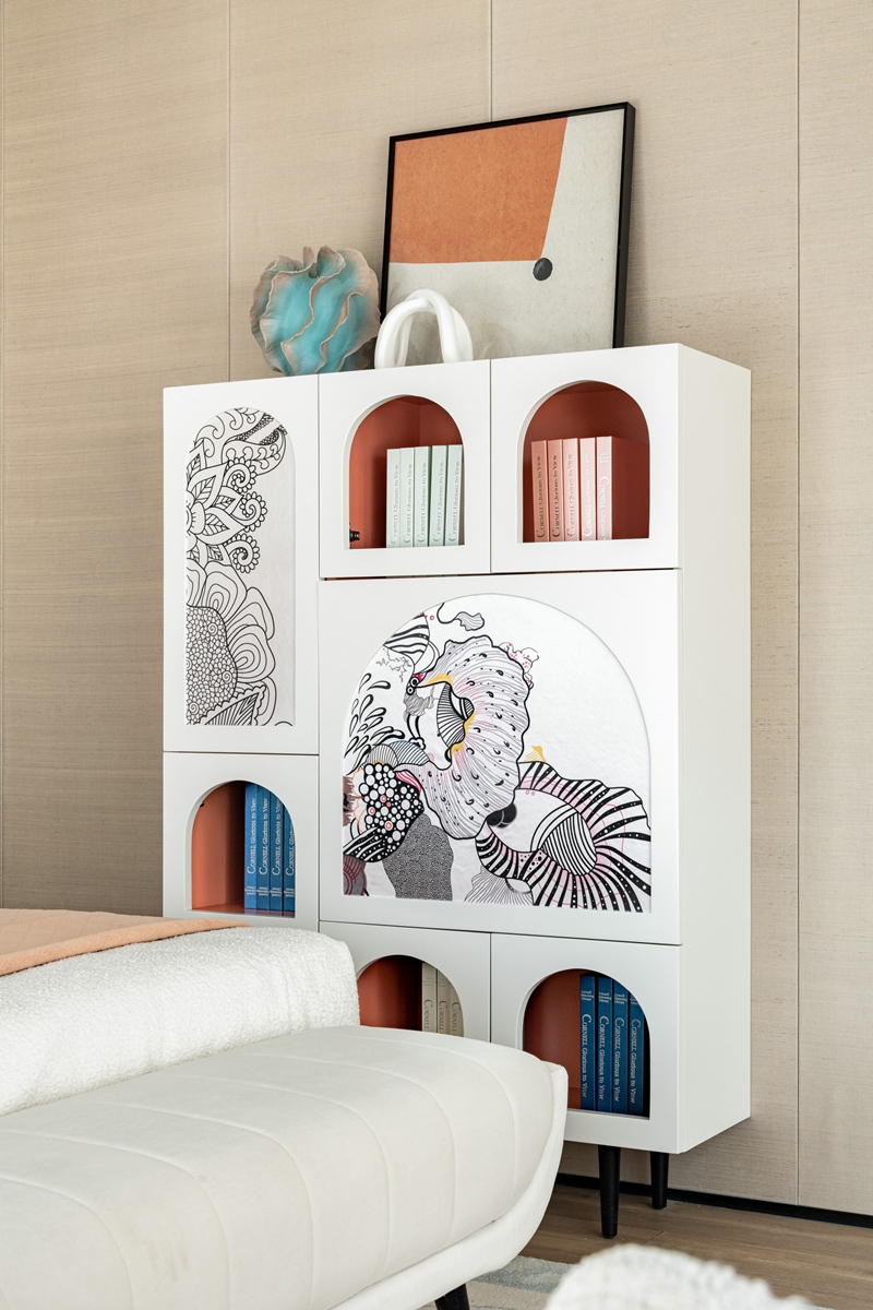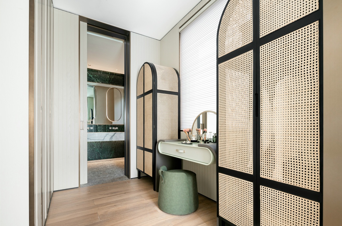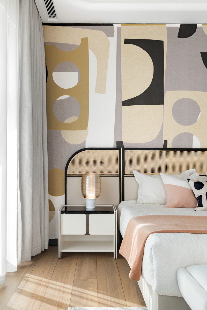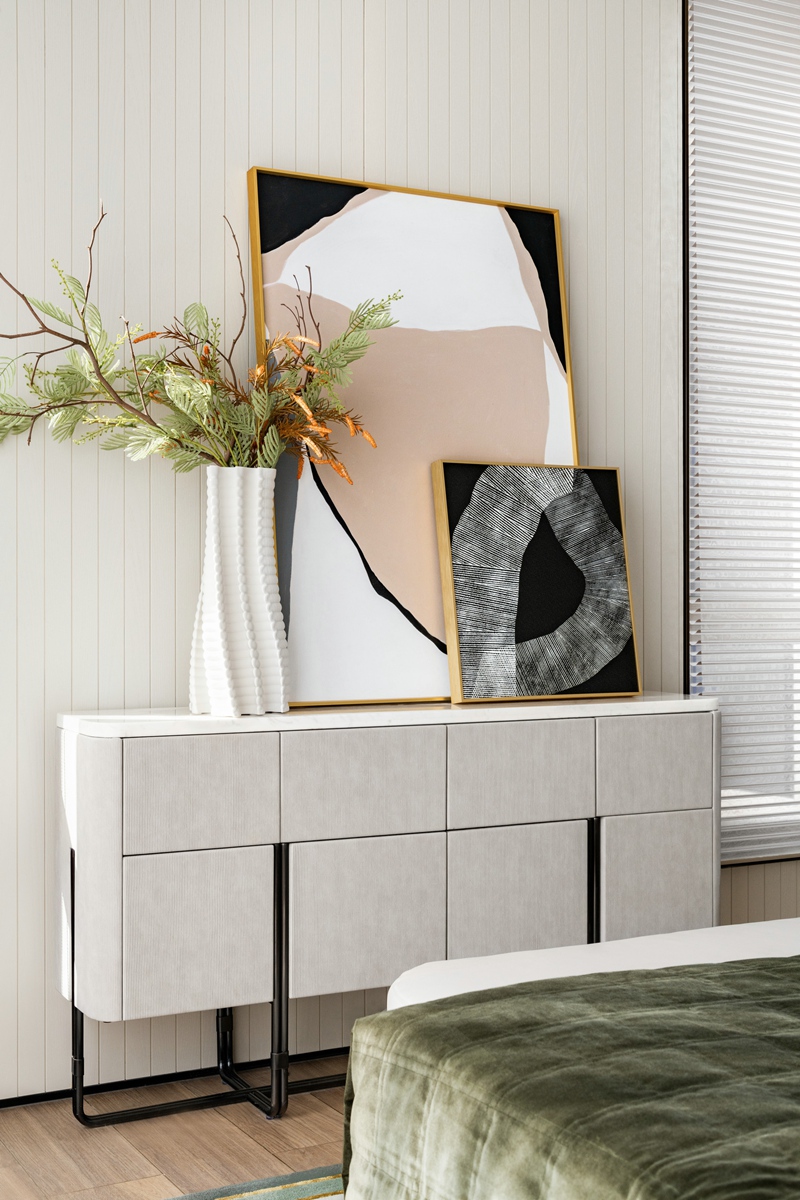 床头背景的抽象线条如黑胶唱片的纹路,将艺术张力延伸至休憩空间。墨绿绒面床品如森林暮色,包裹住床榻的柔软;藤编床尾凳的自然肌理,与金属灯具的冷光相映成趣,而通向卫浴间的动线里,大理石与木质的材质对话仍在延续——当野性设计遇见温柔触感,睡眠便成了与艺术共眠的奢享。