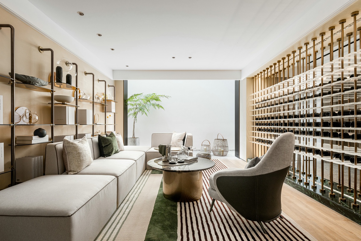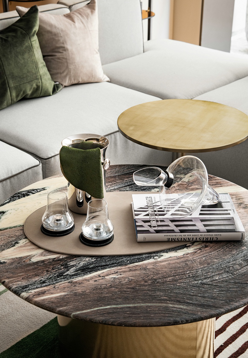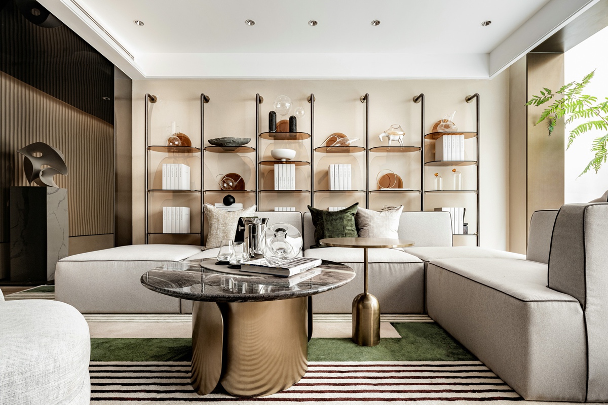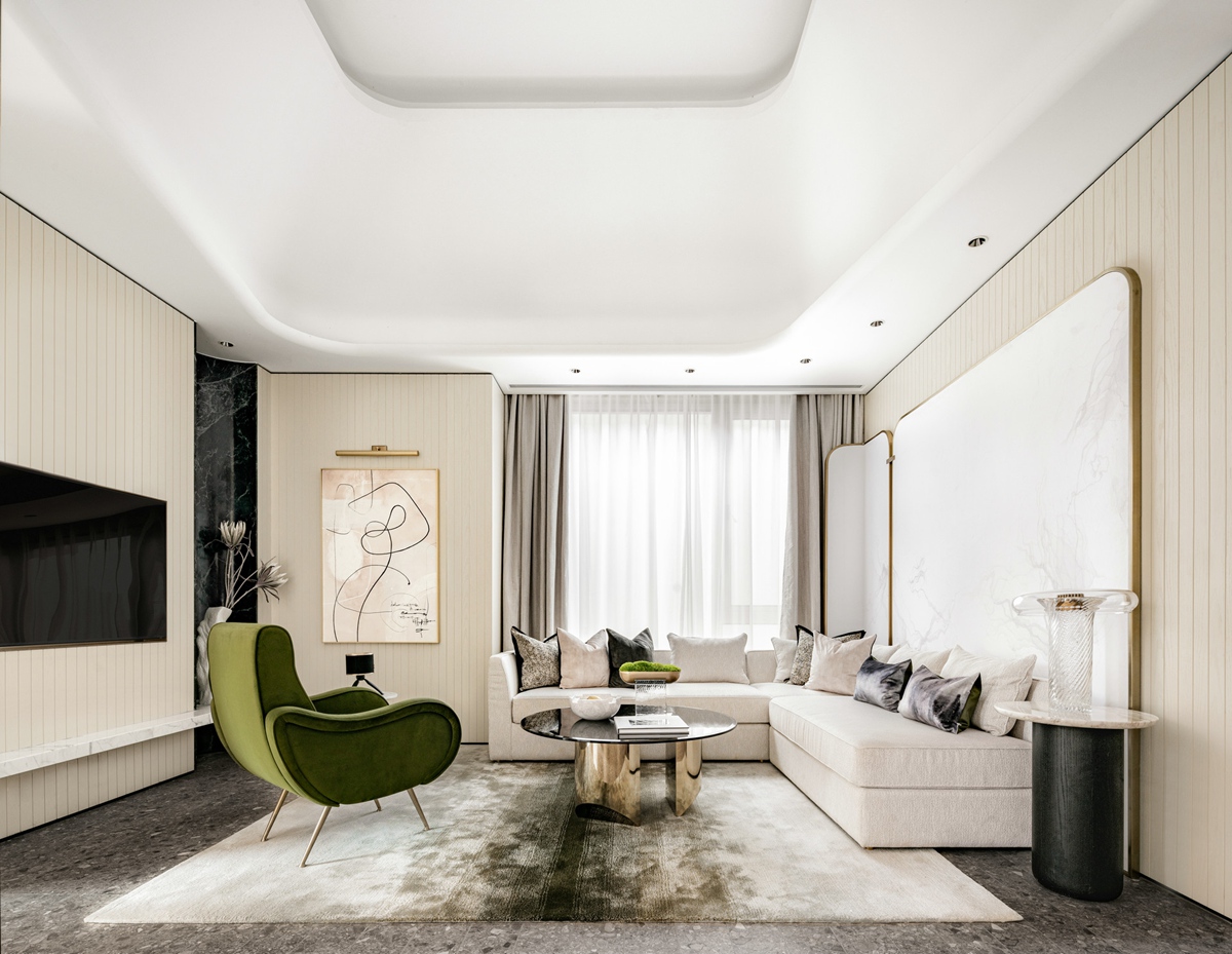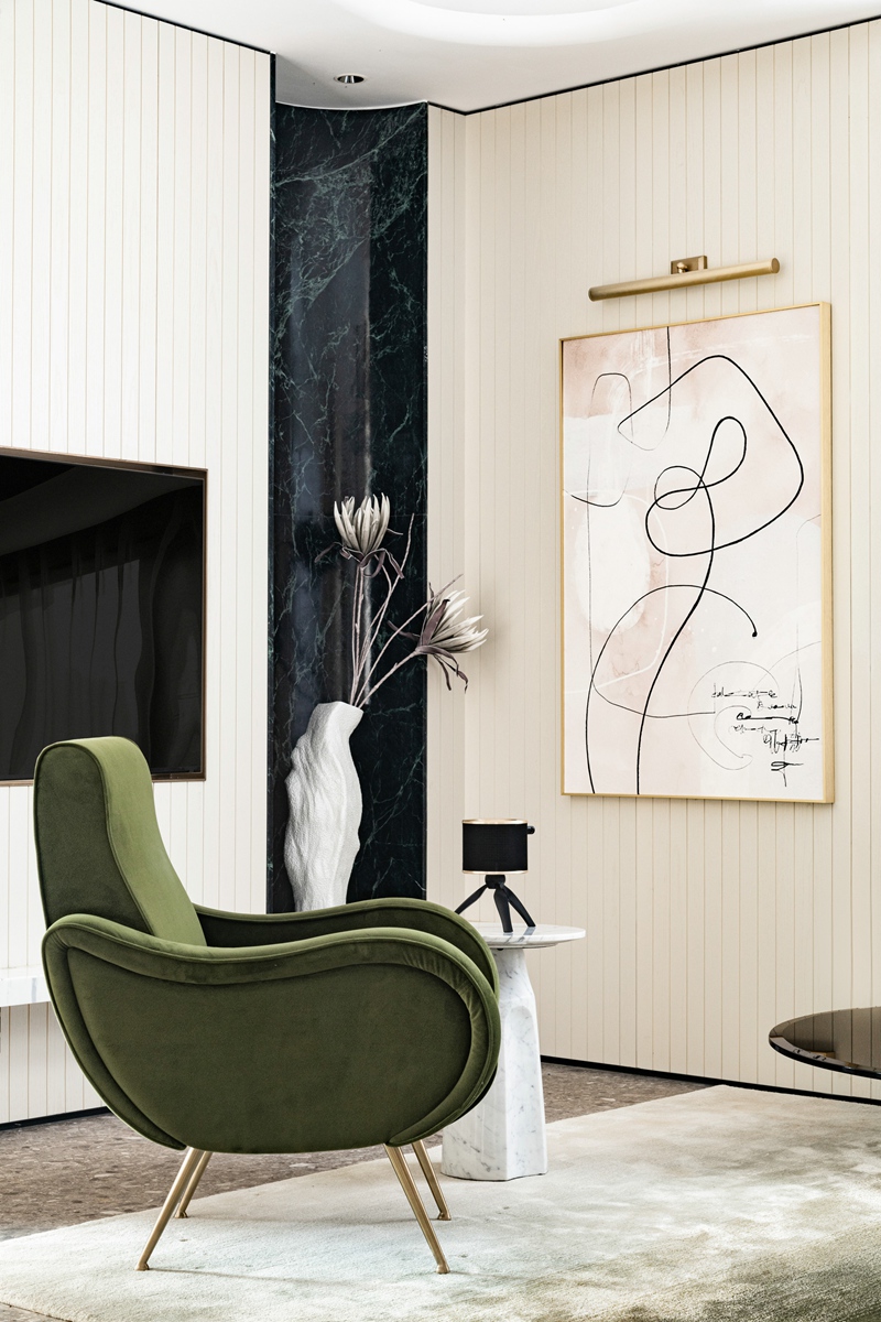 弧形吊顶如被柔化的时光轮廓,将光线温柔地铺陈在空间里。竖纹墙板的秩序感,与墨绿大理石的野性纹理碰撞出戏剧张力;橄榄绿单人椅如艺术雕塑,以大胆色彩打破米白沙发的沉静,而金属底座的玻璃茶几,让奢华感在光影折射中悄然流转——在这里,每一次落座都是与“优雅棱角”的亲密对话。