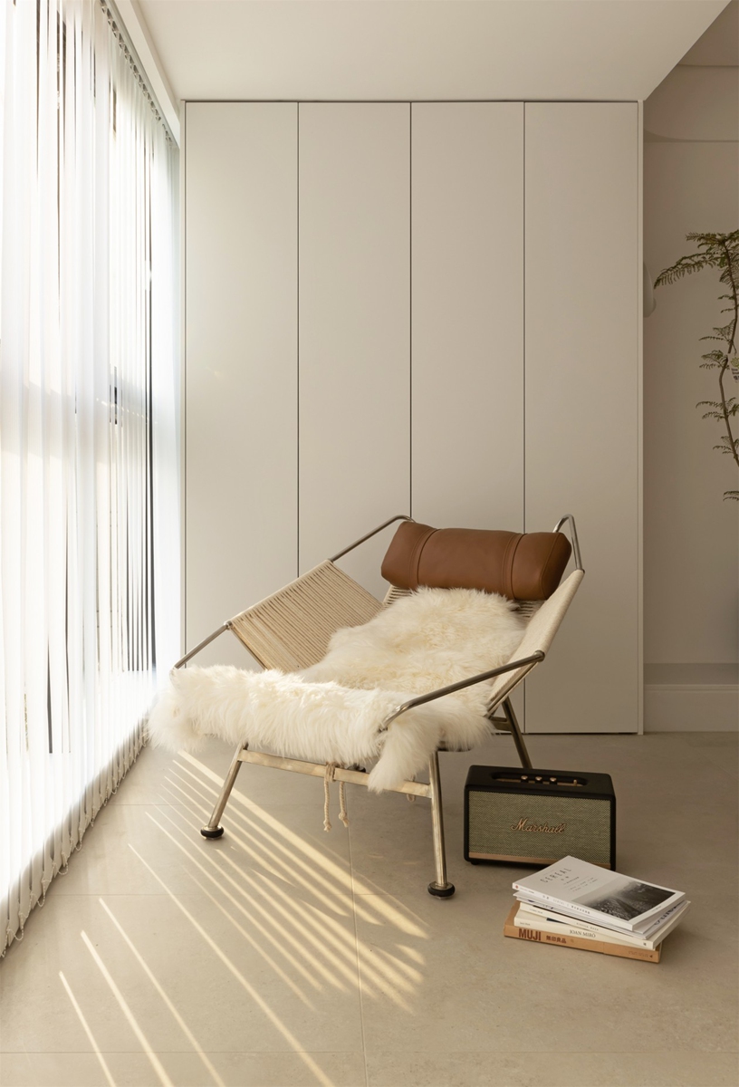 琥珀色吊灯如凝固的蜂蜜,在圆形餐桌上方晕染出暖调光晕;金属椅腿的冷冽线条,与藤编椅面的自然纹理碰撞出复古张力。门边悬挂的风衣与皮包,将“家的烟火”与“日常出行”悄然衔接,而台面的柑橘与干花,让餐厨空间既容得下烹饪的烟火,也盛得下晚风里的小酌时光。