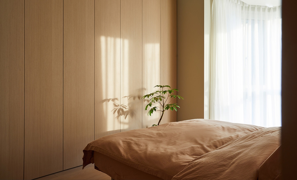 奶杏色墙面晕染出温柔基底,暖棕床品裹住深夜的松弛。原木小边几、弧面壁灯的细节里,藏着自然材质的温度;拱形门洞如时光的通道,将室外绿意悄悄引入,关上门,便是卸下疲惫、回归自我的疗愈场域——没有多余装饰,却用色彩与形态的温柔,把“睡眠的安稳”“独处的自在”都揉进每一寸空间。