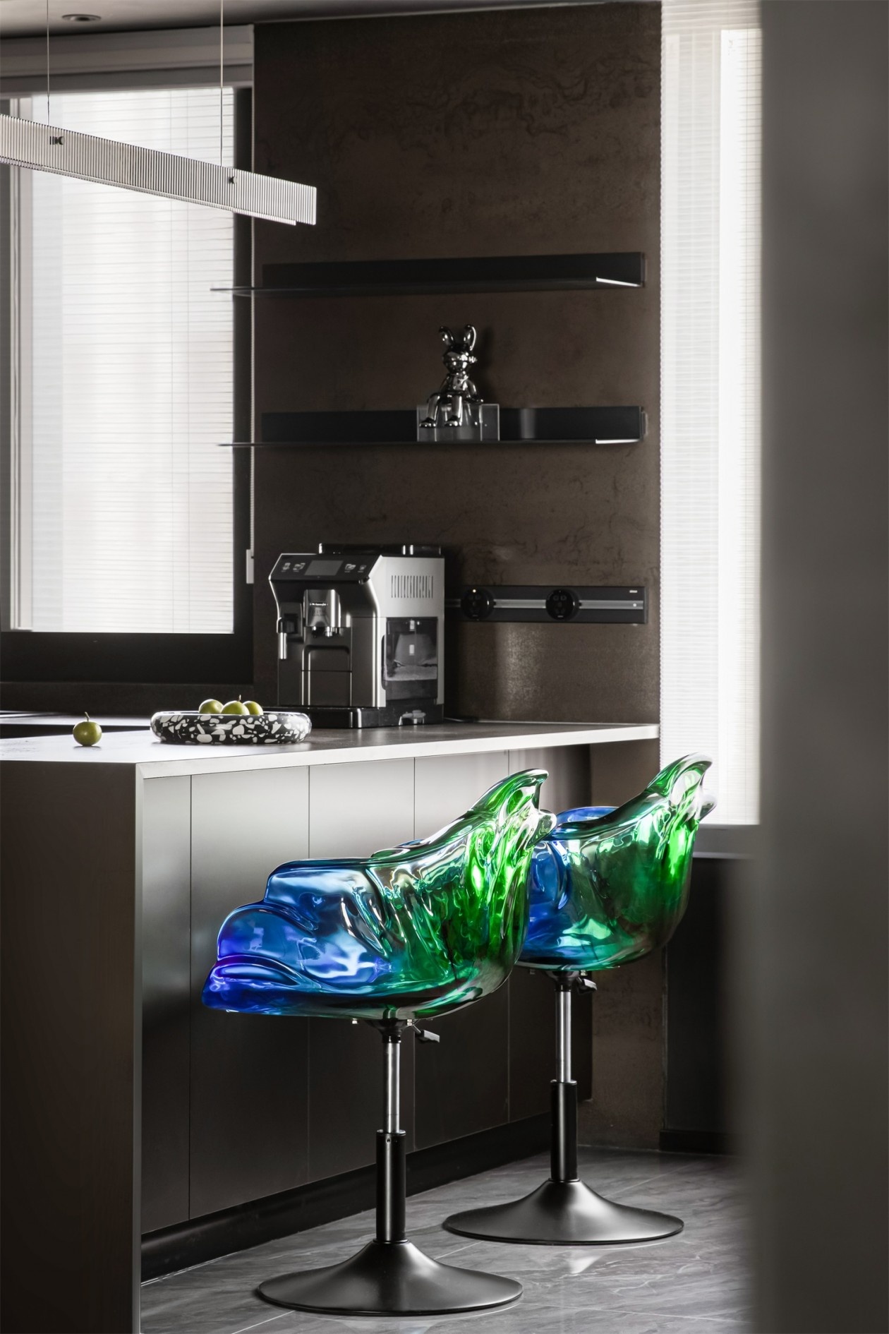 高级灰与深棕的橱柜配色,是冷静与温暖的绝妙平衡。一体化的厨电设计将功能隐于美学之下,岛台旁的艺术感吧台椅如琉璃雕塑,为烟火气的厨房注入艺术灵韵。在这里,烹饪不再是单调的家务,而是在先锋设计包裹下的生活创作,每一次下厨都是一场关于“实用美学”的先锋实验。