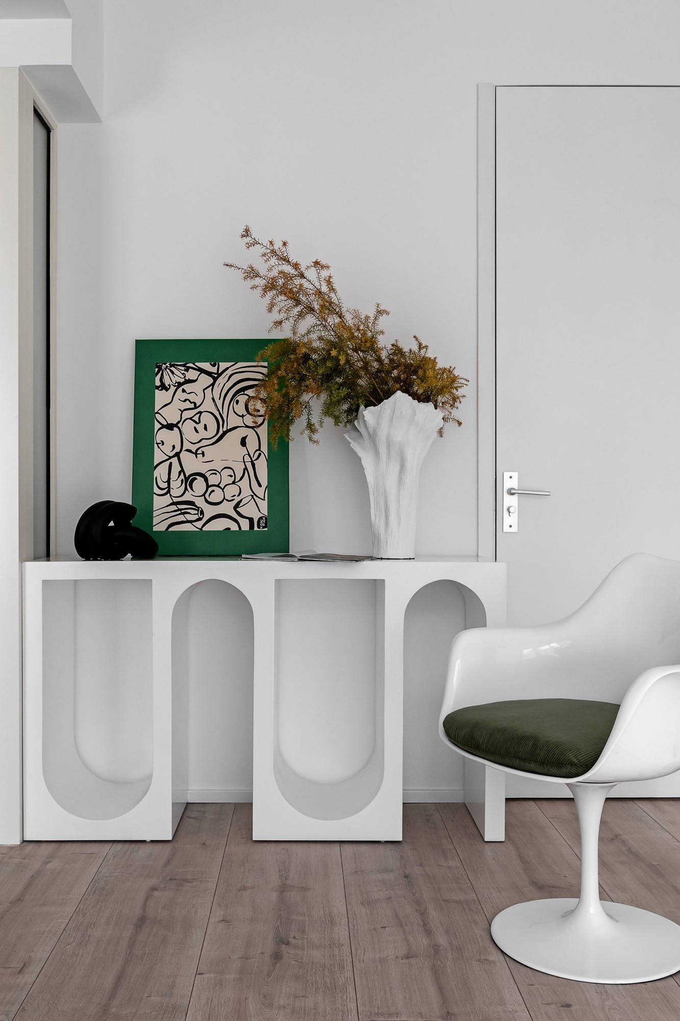 浅米色模块沙发如云朵般舒展,搭配透明质感的圆形茶几,在木质地板的温暖基调上,勾勒出松弛的会客场域。一侧的灰色餐厨区以复古SMEG冰箱点睛,木色层架与玻璃柜的组合,让收纳也成了艺术陈列;整面白色定制柜体则将琐碎隐于无形,在极简线条里,装下生活的从容。阳光透过百叶洒下,光影在空间里游移,每一处留白都是给生活的呼吸感。