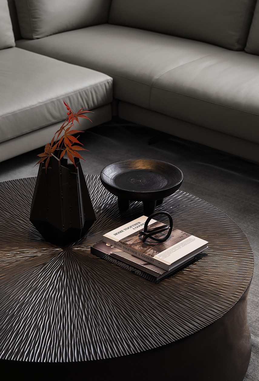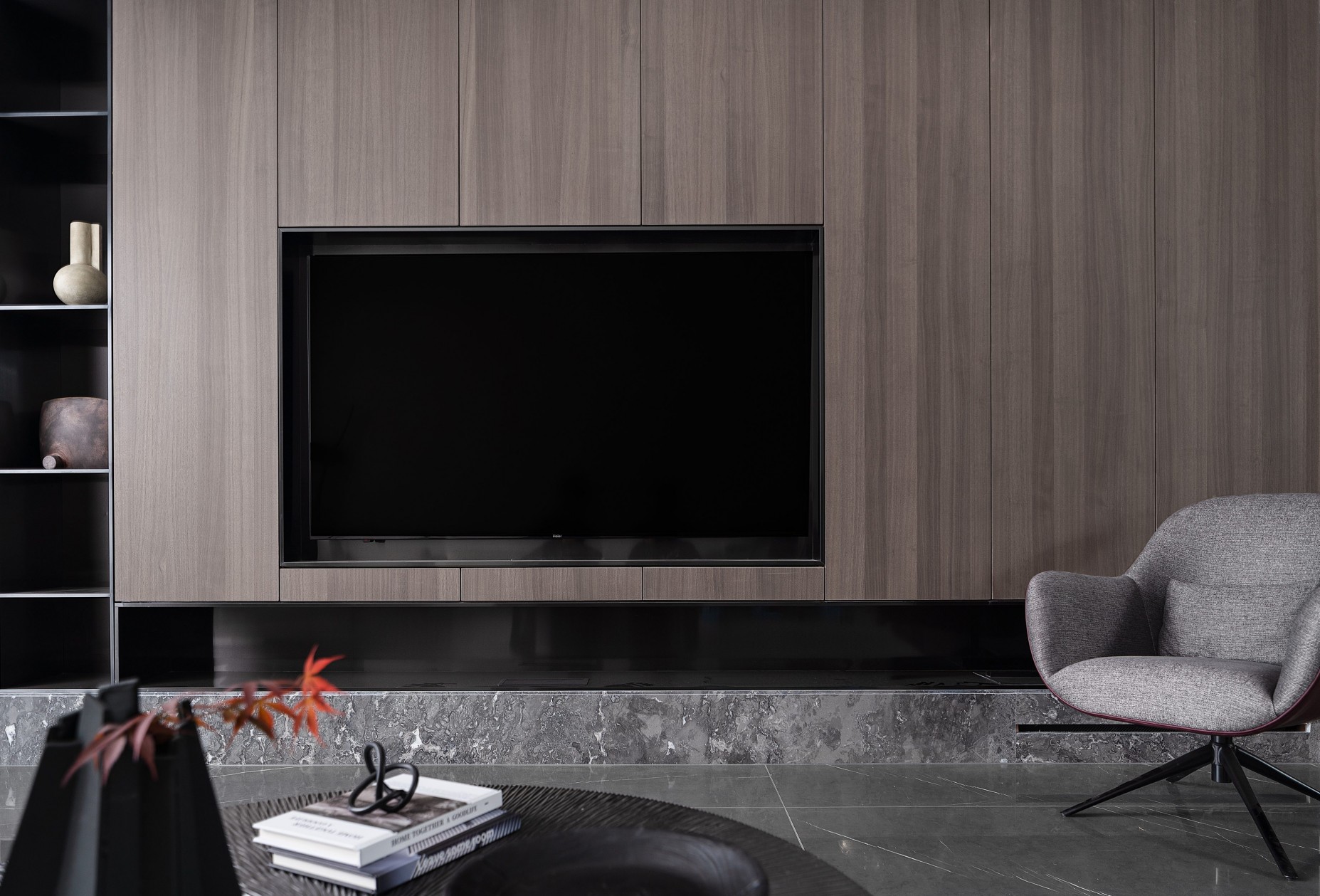 微水泥墙面的细腻肌理,与烟熏木饰面的温润质感交织,勾勒出冷静又奢华的空间调性。浅灰真皮L型沙发以慵懒姿态拥抱生活,圆形金属茶几的厚重与壁炉的跃动火焰形成张力,在无主灯设计的光影层次里,每一处细节都在诉说当代精英的品位独白。