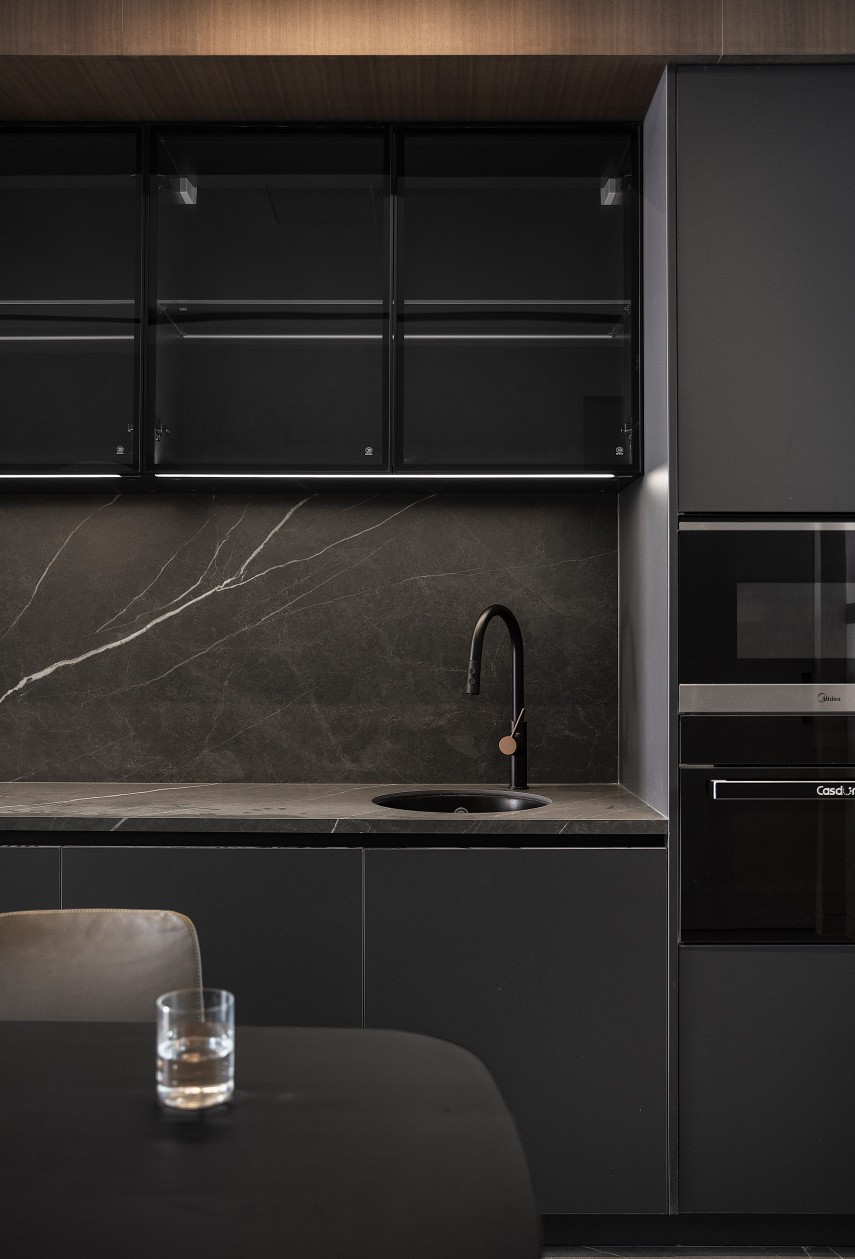 黑白撞色的橱柜系统,以几何秩序构建高效烹饪场域。中岛台的纯白大理石纹,在深灰墙面的衬托下尤为醒目,嵌入式厨电与隐藏灯带的设计,将功能性隐于极简美学,百叶窗过滤的光线洒入时,整个空间便成了现代厨房设计的理性教科书。