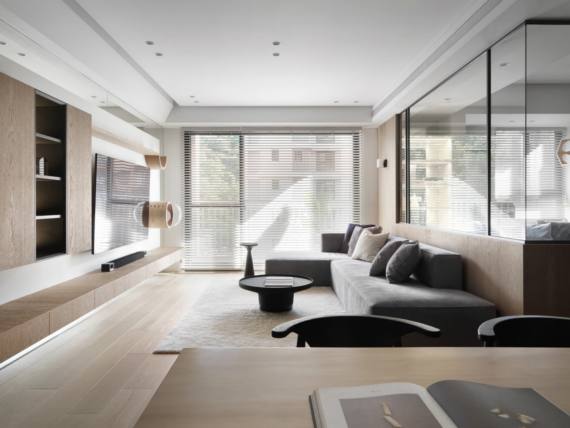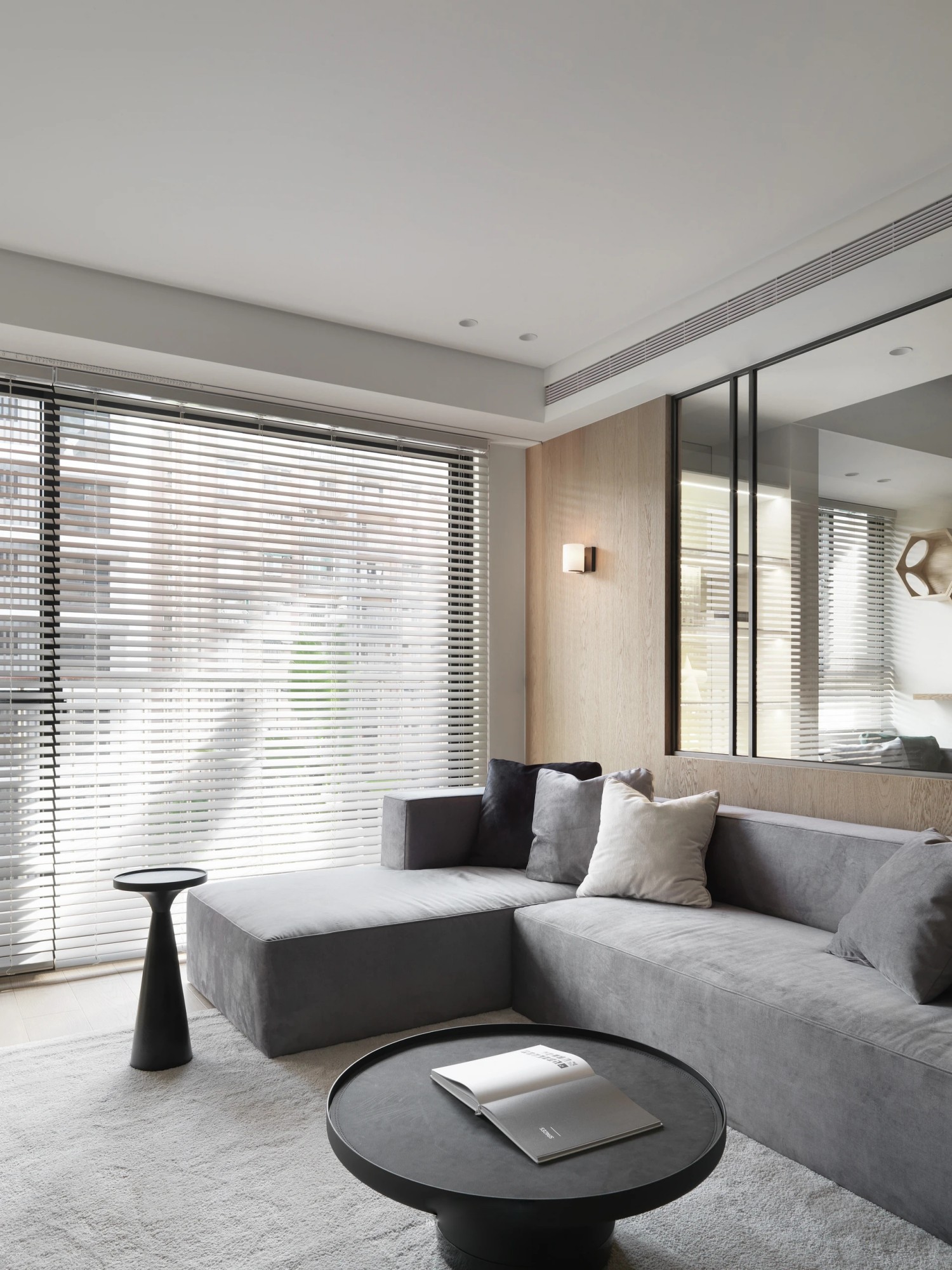 浅木色的柜体与地板勾勒出空间的温润底色,灰色L型沙发以慵懒姿态容纳生活的松弛时刻。无主灯设计让光线如呼吸般自然散落,玻璃隔断模糊了空间边界,却让通透感倍增。在这里,每一处线条都极简利落,每一抹色彩都克制内敛,猫咪的原木游乐区更添生活意趣,让简约空间漾起温暖涟漪。