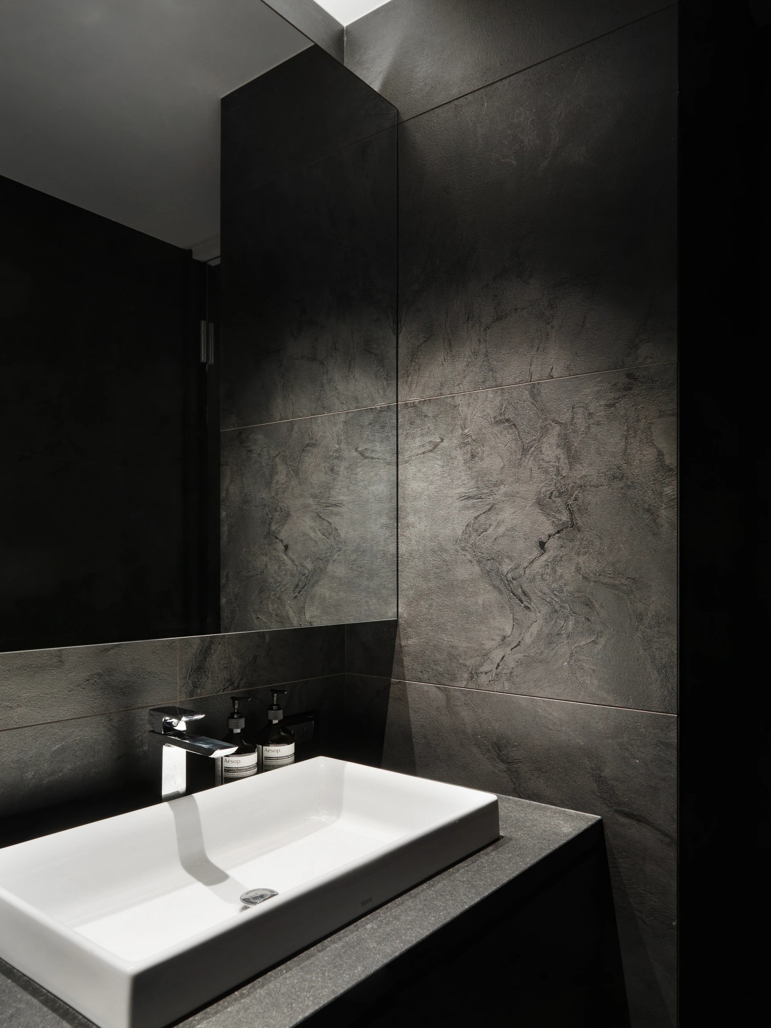 深灰石材纹理在光影中晕染出高级质感,纯白台盆如艺术雕塑般点亮空间。极简的线条、克制的色彩,让卫浴成为一场关于“精致仪式感”的私享剧场。每一次洗漱,都是在暗调美学中,与质感生活的深度共鸣。