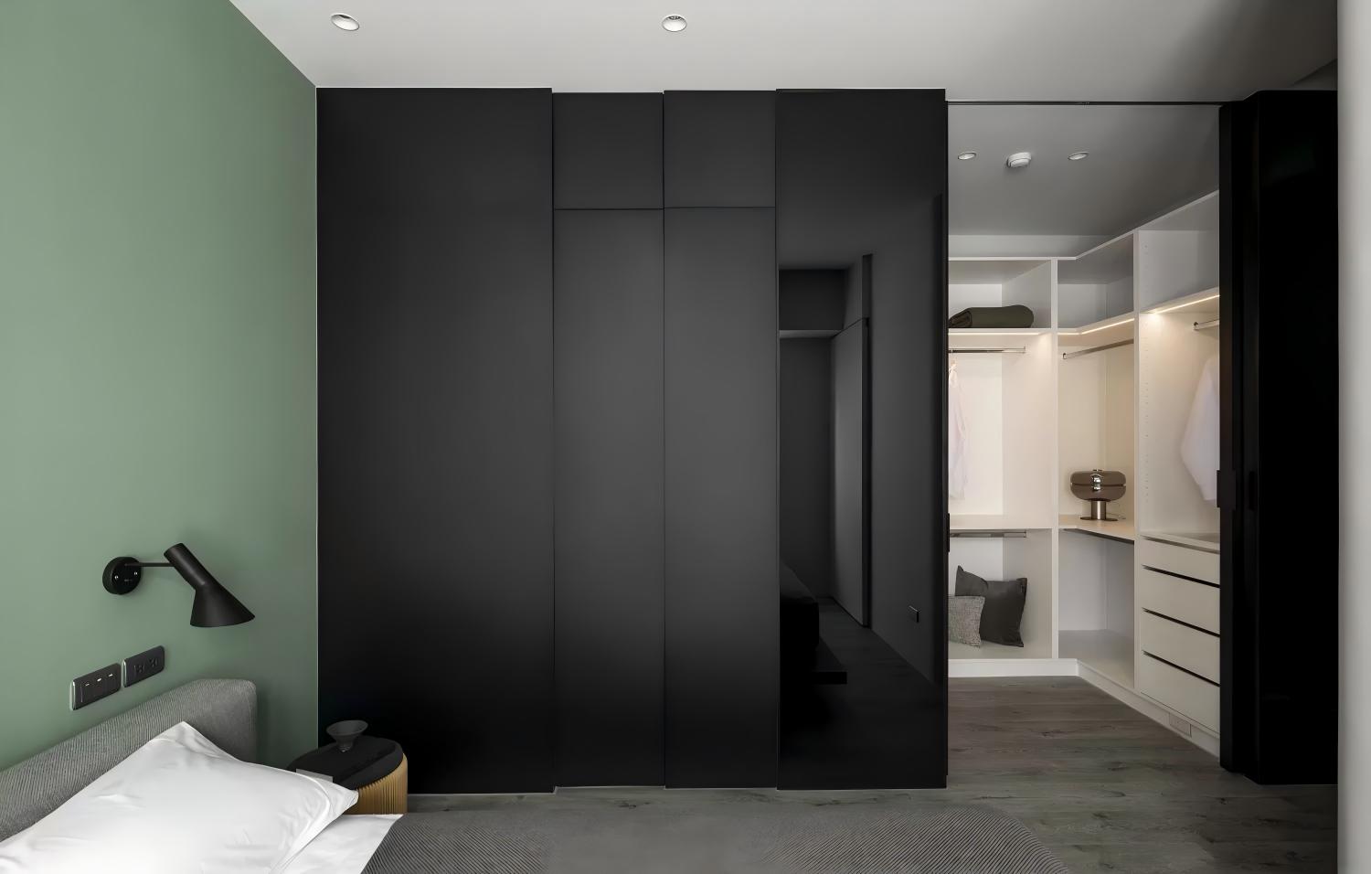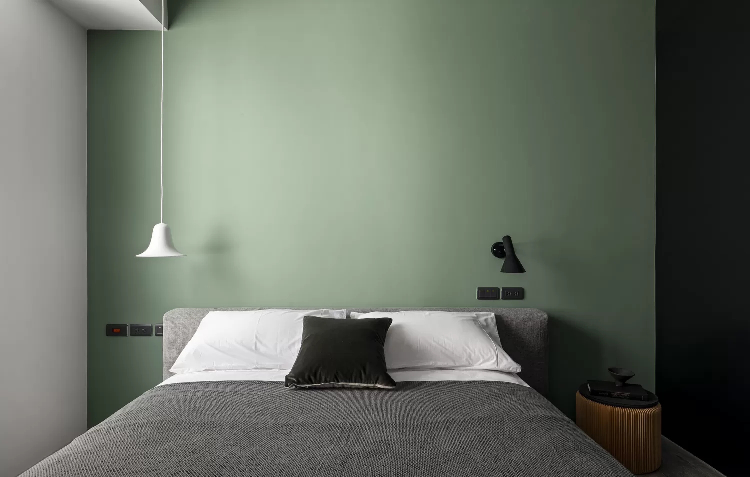 • 背景墙用莫兰迪绿+灰色床品,低饱和色调自带松弛滤镜;床头配“白+黑”极简灯具,一明一暗的对比让墙面不单调,又不抢空间的静谧感。