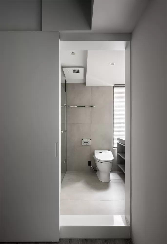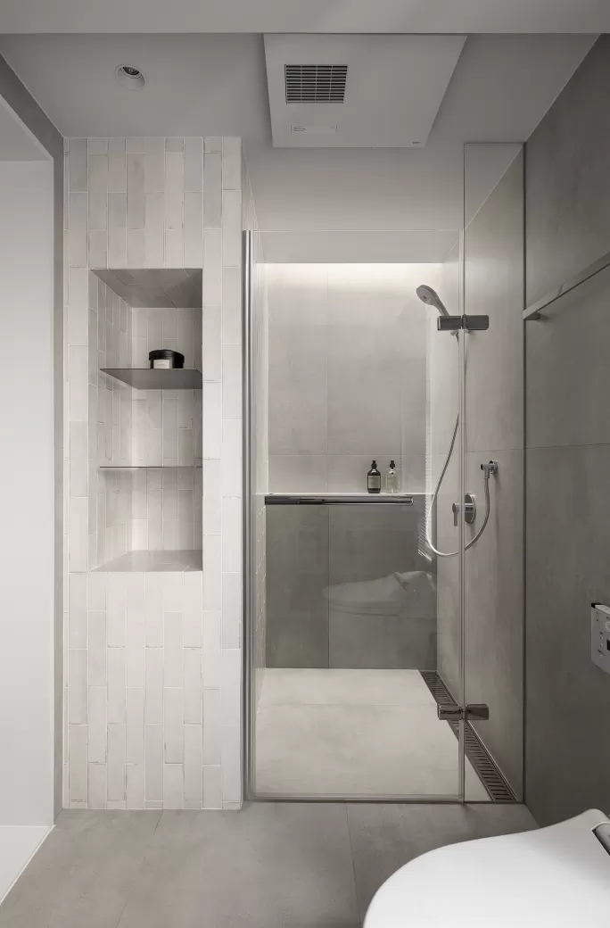• 全空间用浅灰哑光砖+白色竖条砖,材质统一但通过纹理区分区域,高级又不单调;壁龛和悬浮台做嵌入式设计,没有卫生死角,极简又实用。