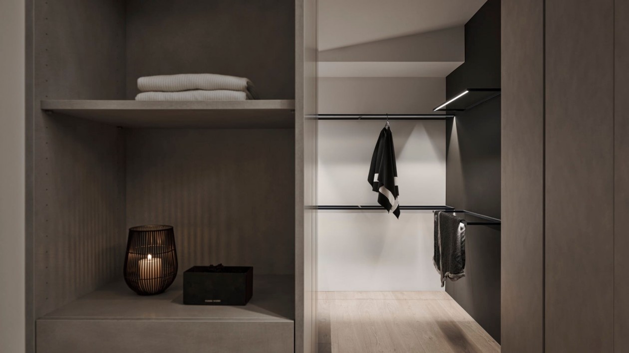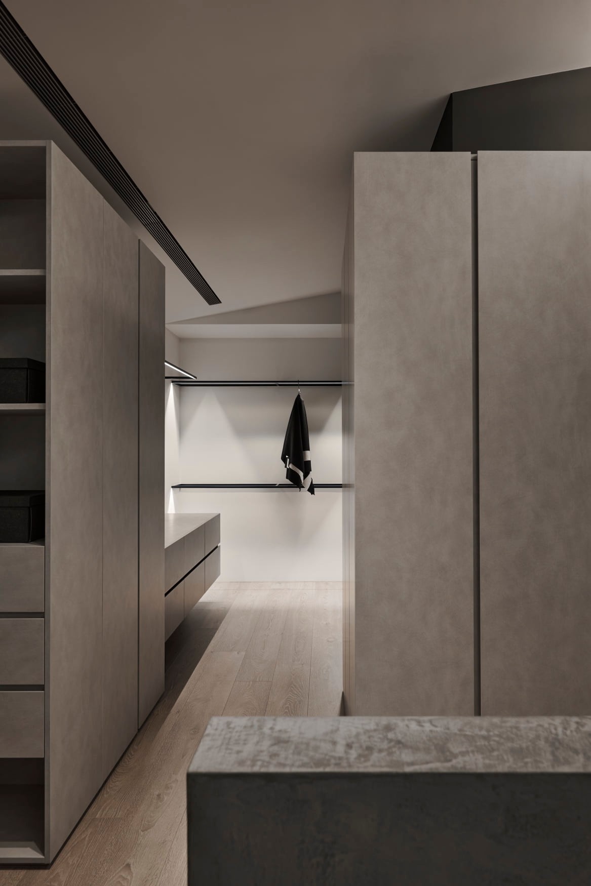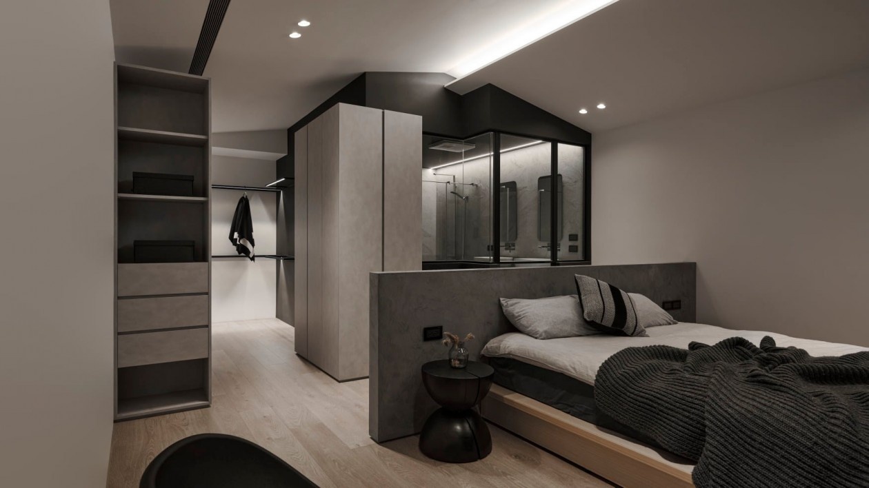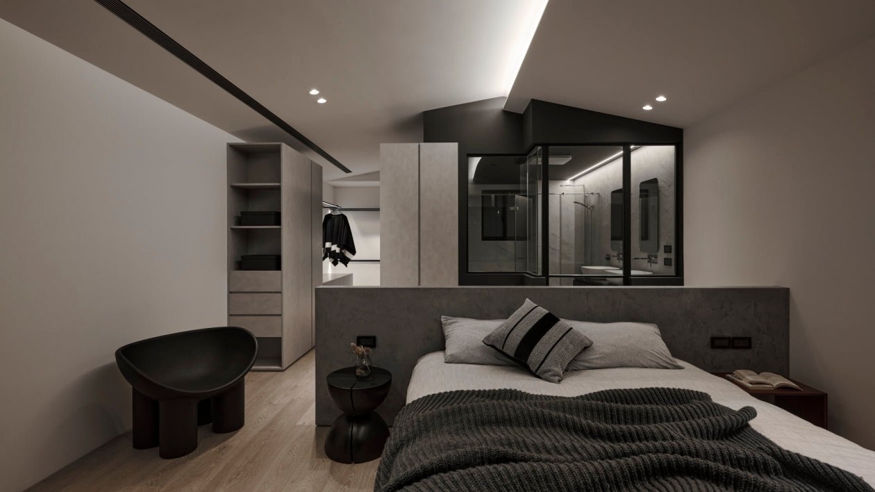 水泥质感的床头做隔断,半透明玻璃将卫浴区嵌入卧室,既保证采光又保留隐私;无主灯+线性灯带营造出低饱和度的休憩氛围,极简柜体藏起琐碎,只留松弛的生活感,角落的异形黑色单椅,是冷调里的设计巧思。