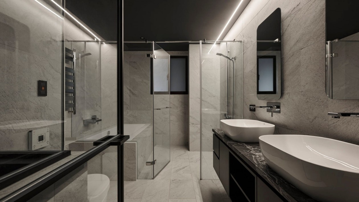 大理石纹瓷砖铺满整个空间,双台盆设计提升日常使用效率,玻璃隔断让小空间显开阔,嵌入式灯光与黑色镜柜呼应,既强化了暗黑系的高级氛围,又用白色台盆平衡了视觉重心,实用与质感兼备。