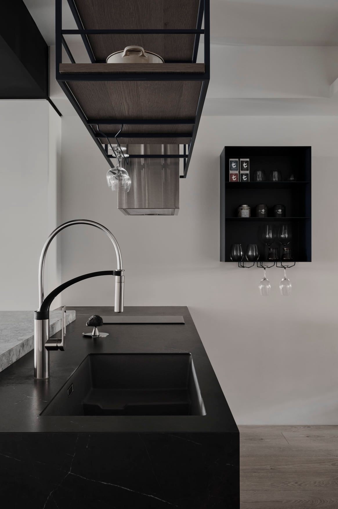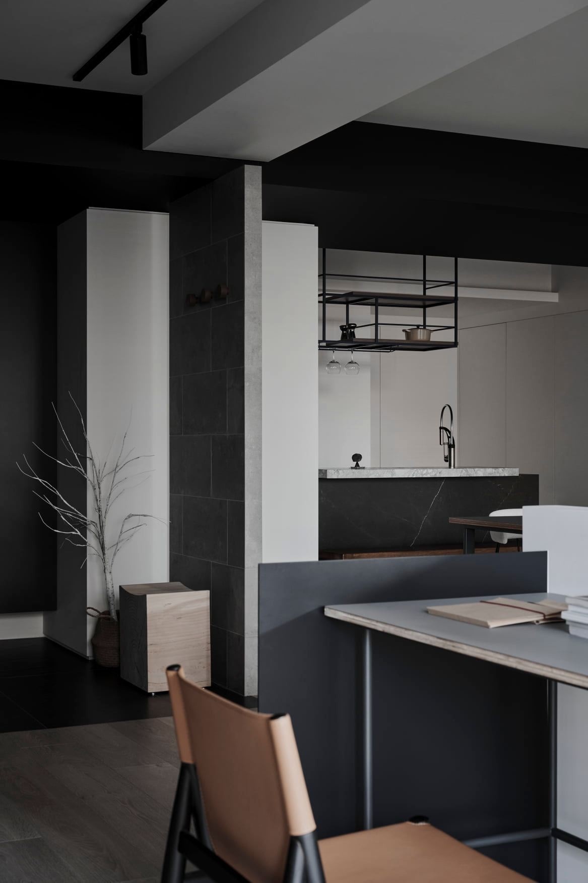 餐厨区以深色岩板台面+金属框架置物架为主,黑灰石材与木质餐椅碰撞出利落的高级感,半开放式隔断既划分功能区,又保留了空间的呼吸感。