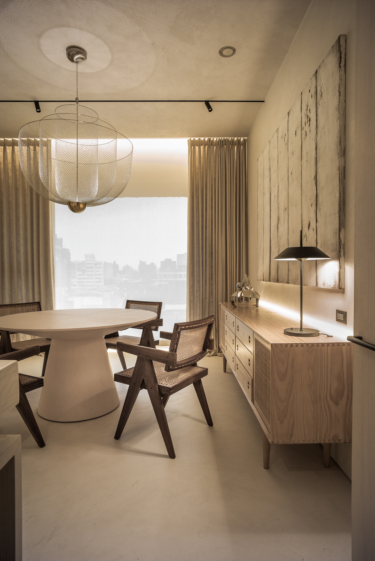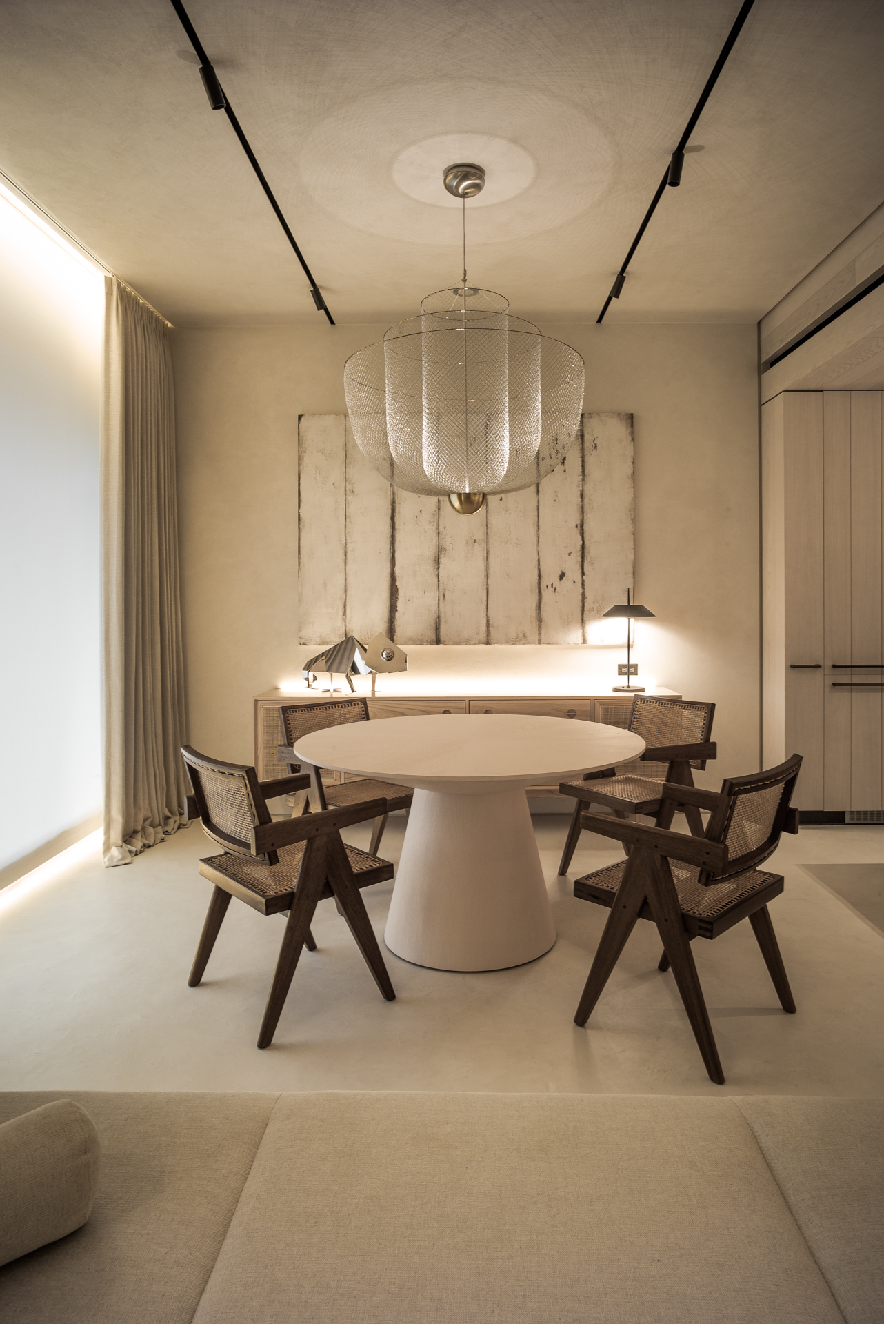• 餐厨区:圆形餐桌+藤编椅自带松弛感,金属网吊灯是点睛之笔,简约中藏着精致