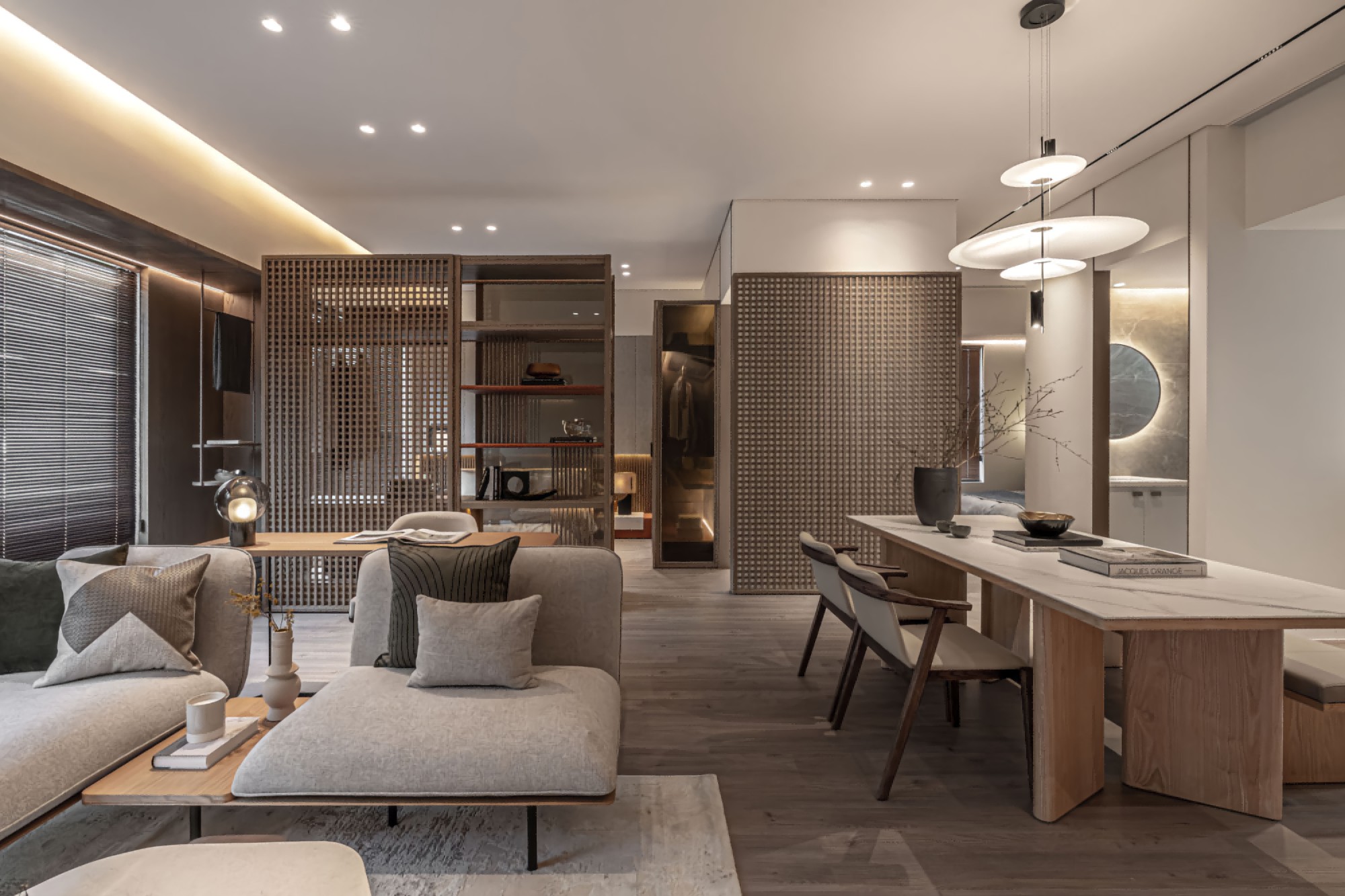 这套是禅意轻奢风的治愈宅,把“温润高级感”揉进了每个空间细节: