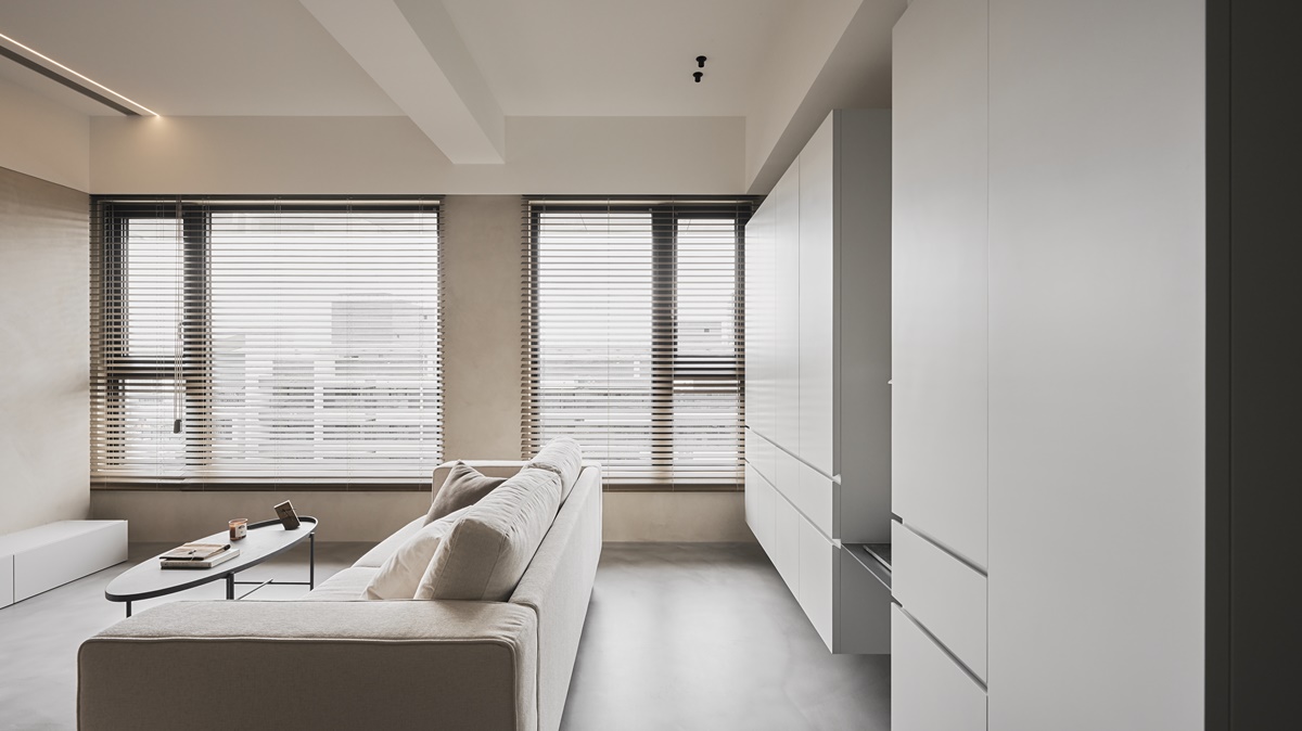 整体用低饱和色系、自然肌理材质(艺术涂料、亚麻、原木),加上隐形收纳、无主灯等设计,既保持了极简的克制,又藏着生活的温度。