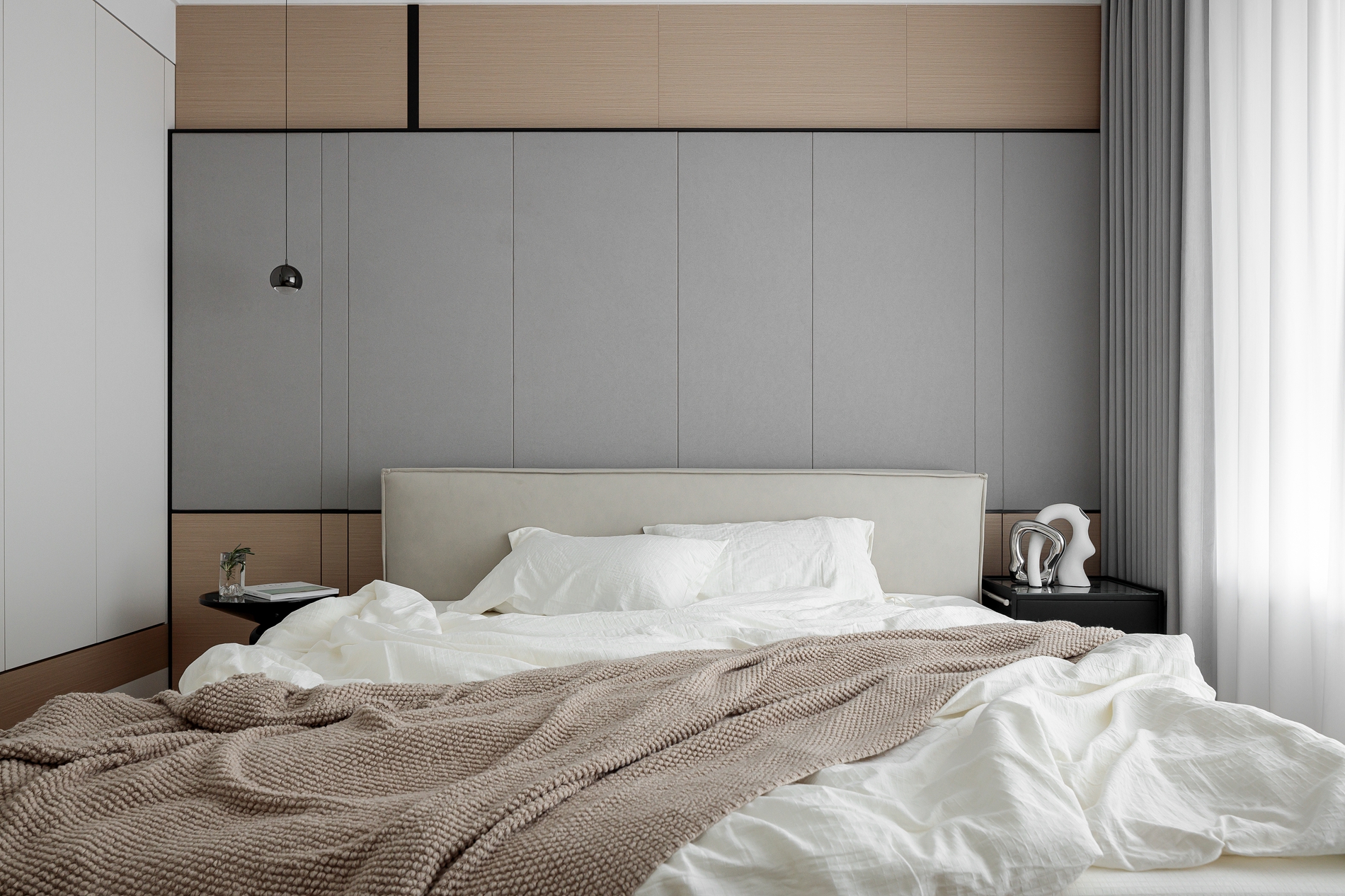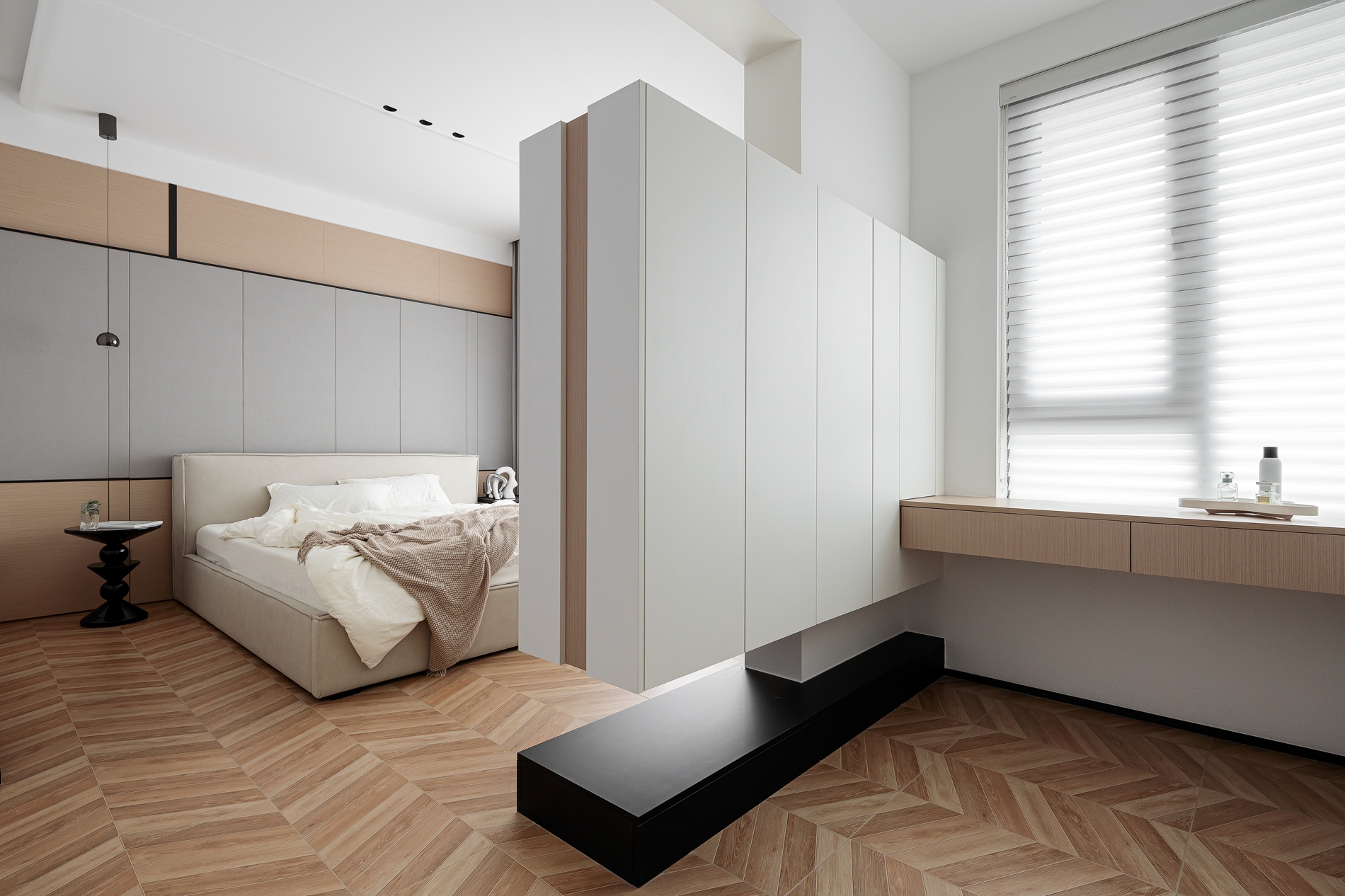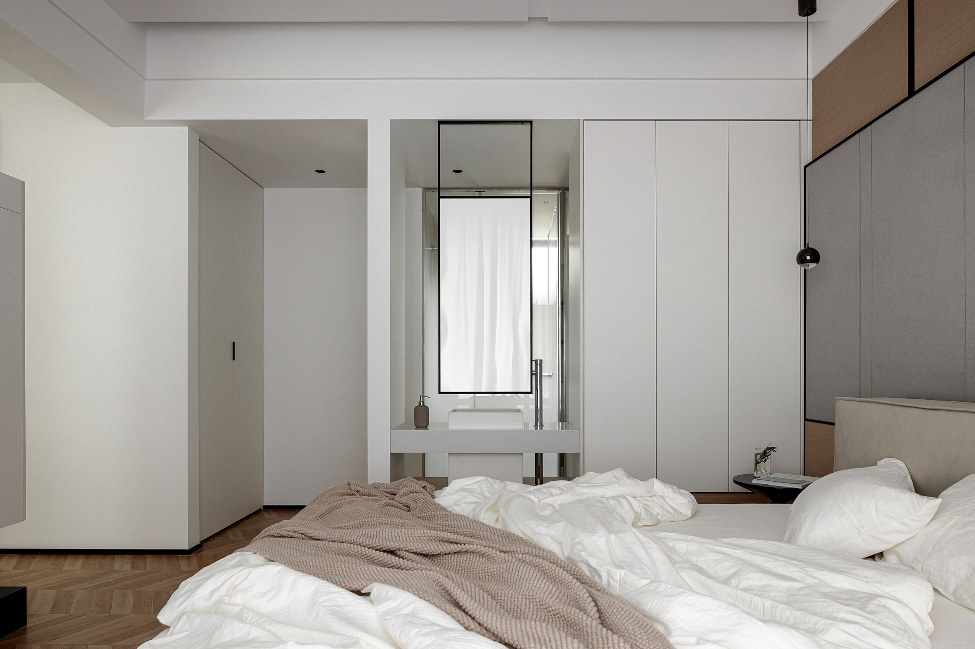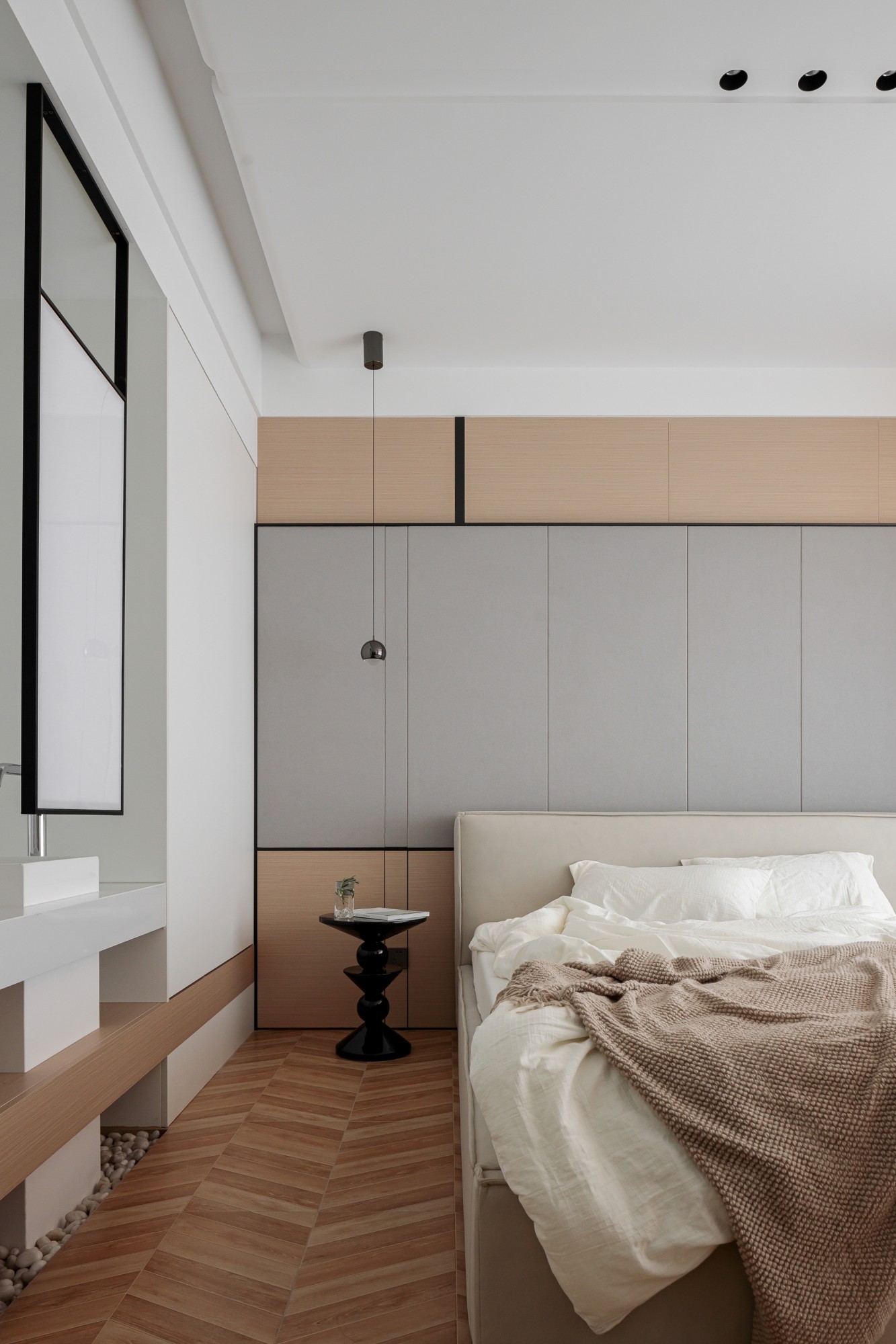 床品选了奶白+浅棕的柔和配色,床头的软包背景墙弱化了空间冷感;衣柜做了“一门到顶+隐形把手”,视觉上干净利落;洗漱区用黑框玻璃隔断,既保证了采光通透,又能做空间区隔;顶面的悬浮吊顶+小吊灯,细节里都是“低调的精致感”,连地板都换成了人字拼木纹,让卧室的温馨度直接拉满。