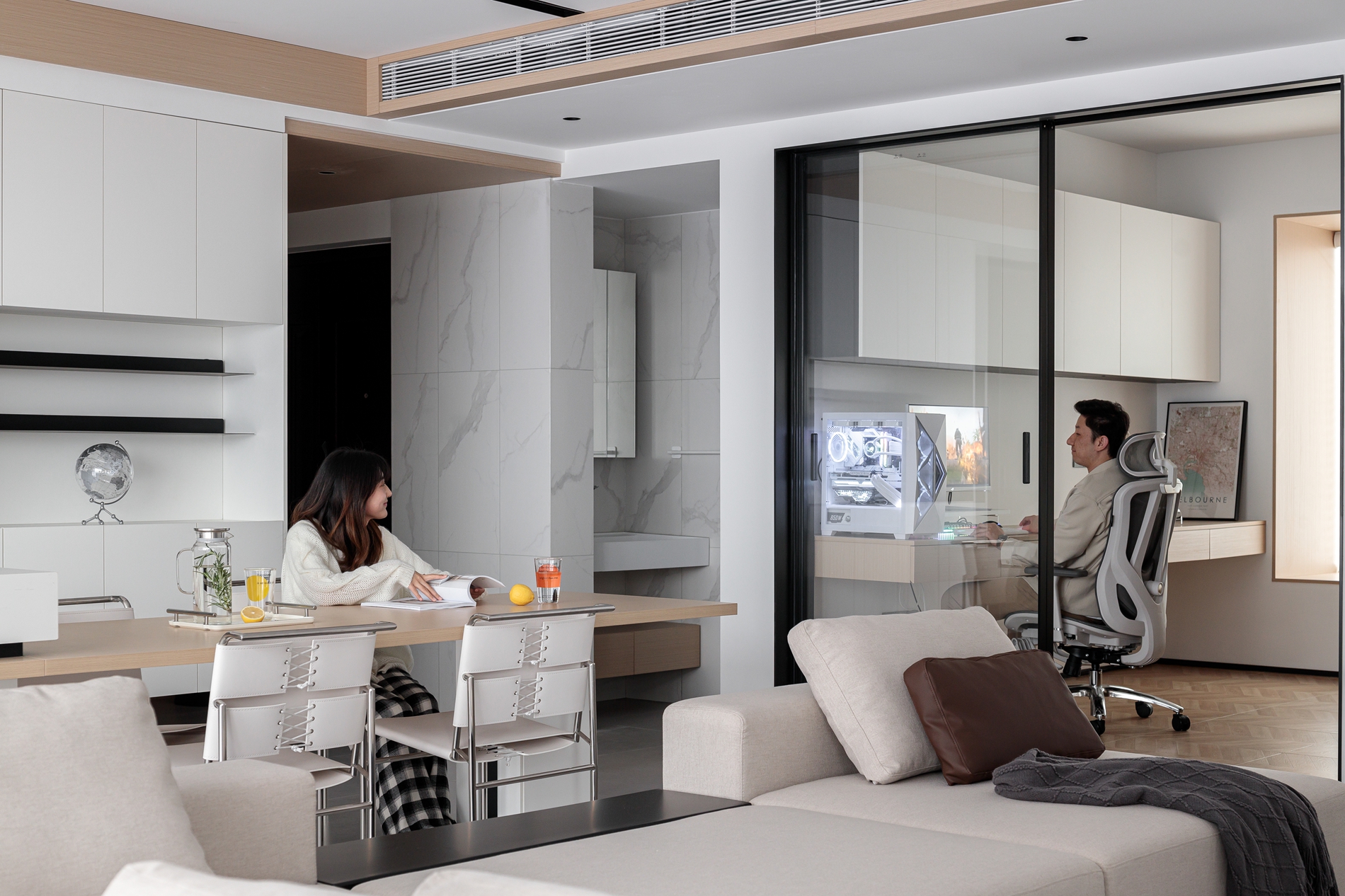 浅卡其L型沙发+白色岩板茶几,用低饱和色系铺出柔和基底,搭一条深灰毛毯增加层次;电视墙做了“悬浮柜体+嵌入式电视”,黑色开放格点缀摆件,下方长形地台藏住线路;顶面的黑色线性灯+木色吊顶,和地面浅灰大砖形成“上轻下稳”的呼应;玻璃百叶帘把自然光柔化后铺满空间,和餐厨区的隔断设计让视线完全打通,整个公共区既开阔又显温馨。