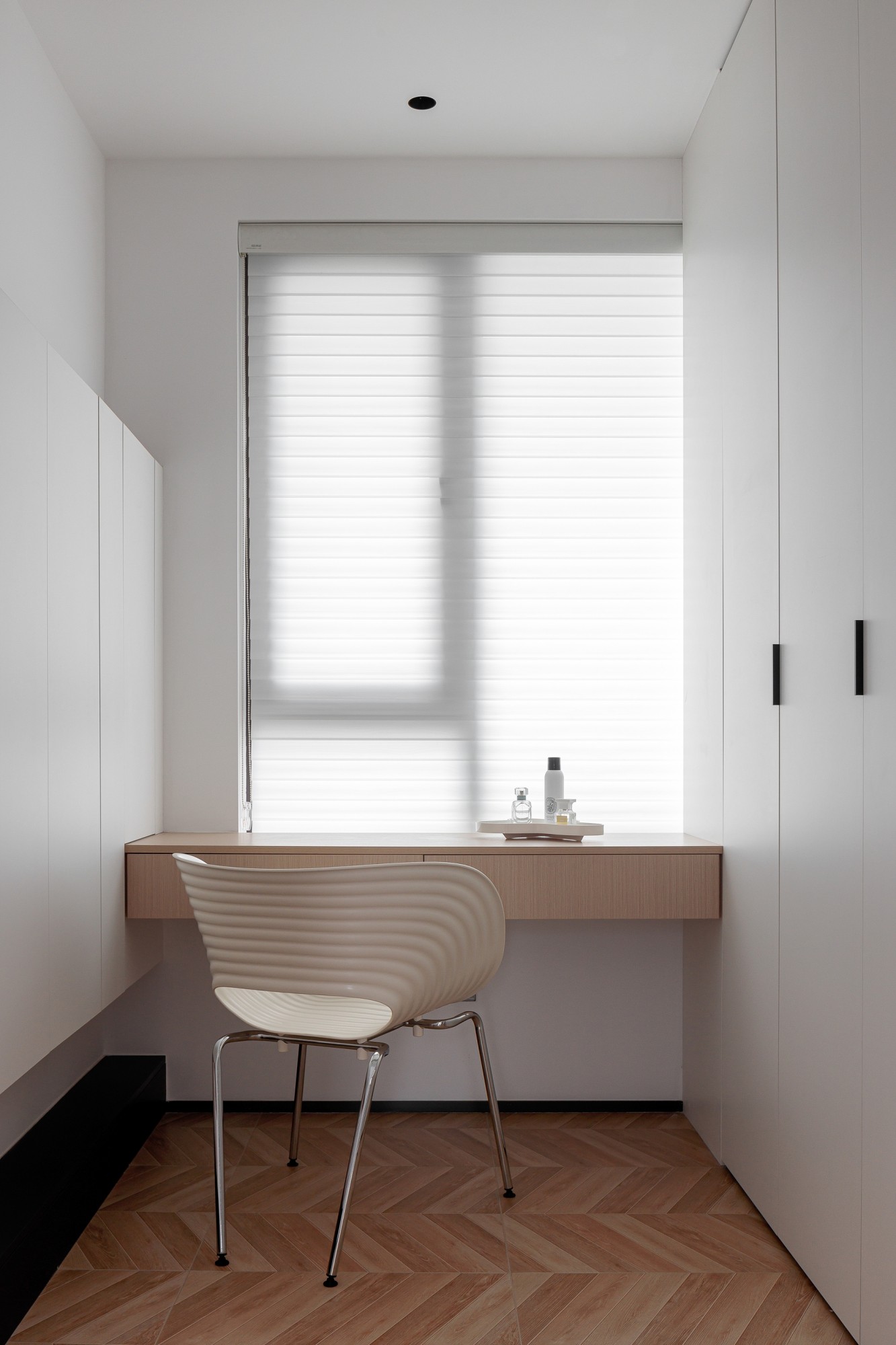 整面墙的悬浮书桌+吊柜,把收纳做到极致,灯光藏在柜底营造出柔和的工作氛围;旁边的开放式书架用“黑+木”撞色,既显层次又能展示摆件;百叶窗能灵活调节光线,搭配人体工学椅,哪怕长时间办公也不会觉得压抑——这个空间把“实用”和“美学”平衡得刚好。