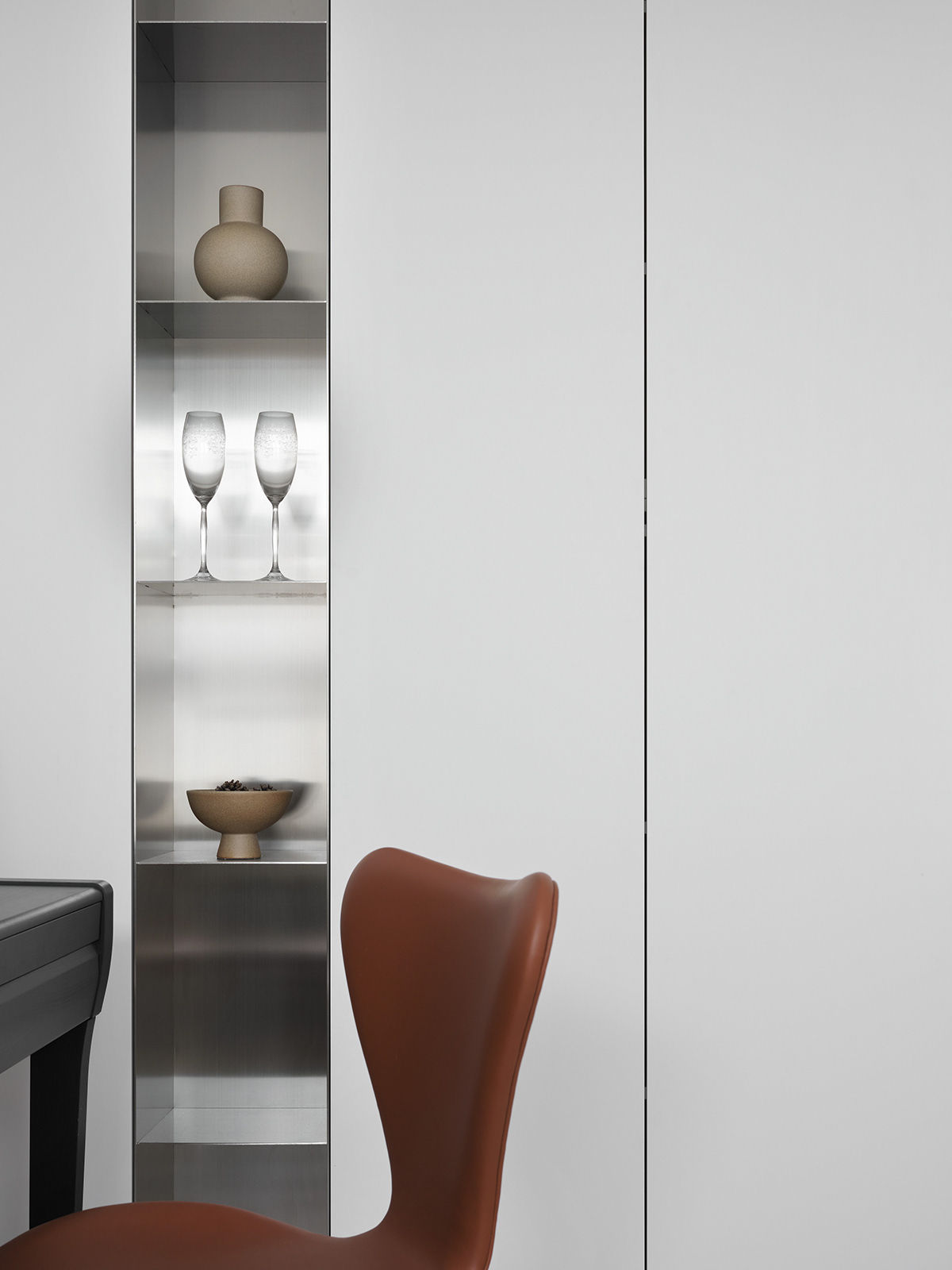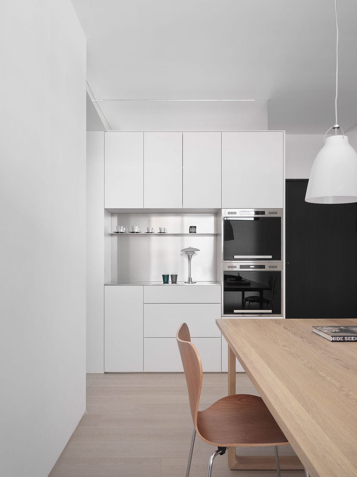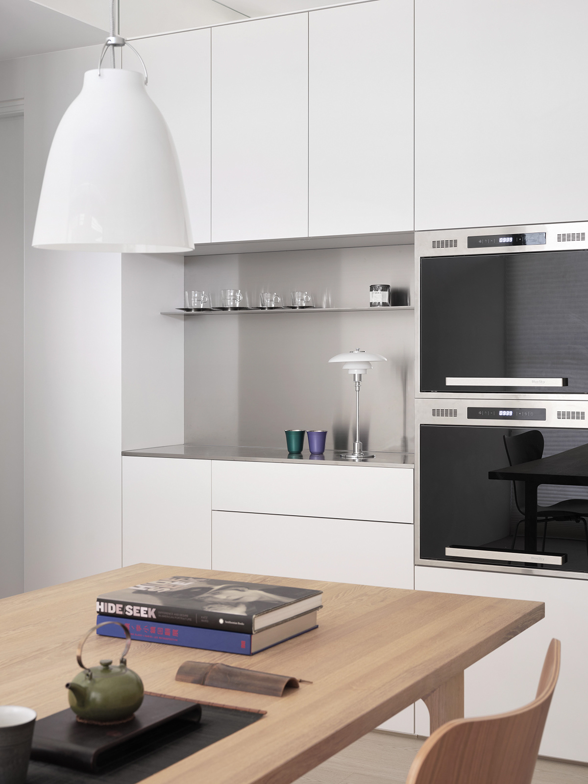 • 餐厨区:白色橱柜+金属质感的台面,和浅木餐桌形成柔和对比,简约中透着精致的生活气息。