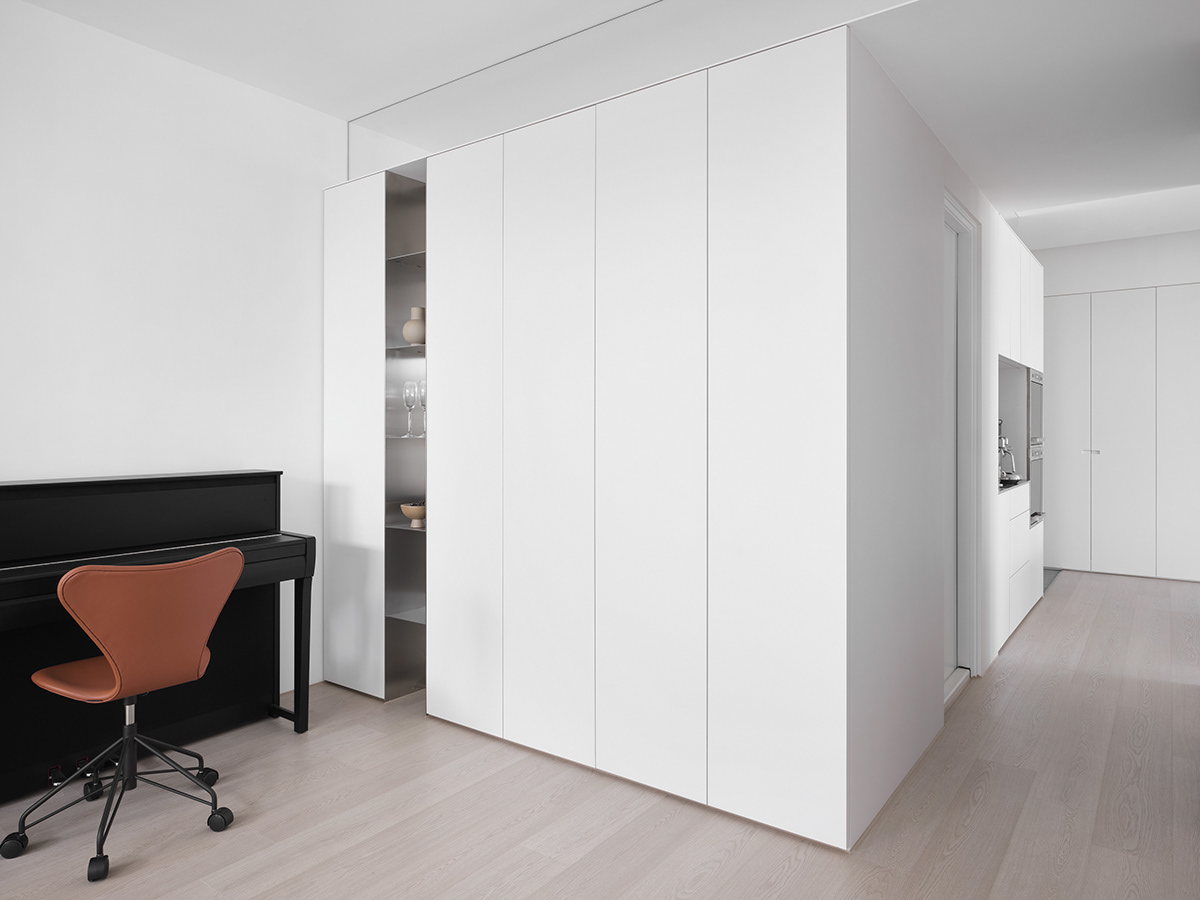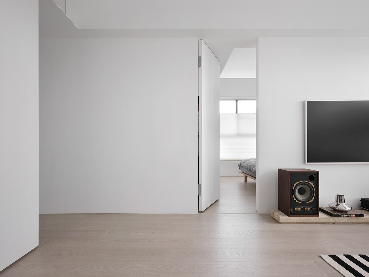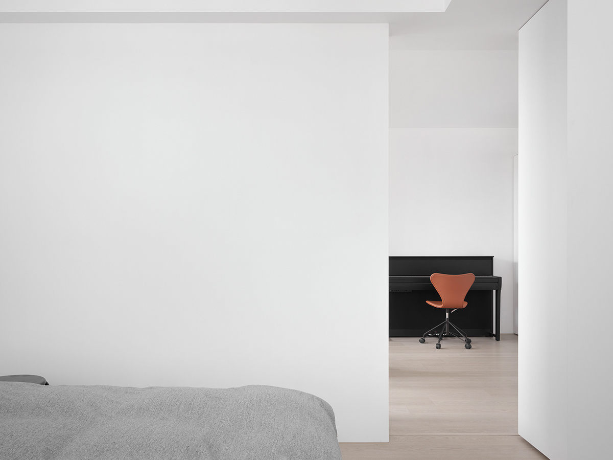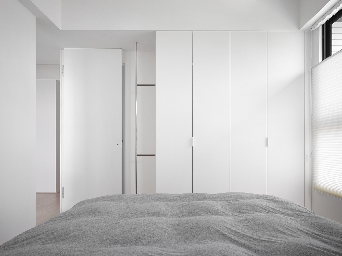 • 卧室:整面墙的白色收纳柜+隐形门设计,把“极简”贯彻到底,浅灰床品让空间更显松弛。