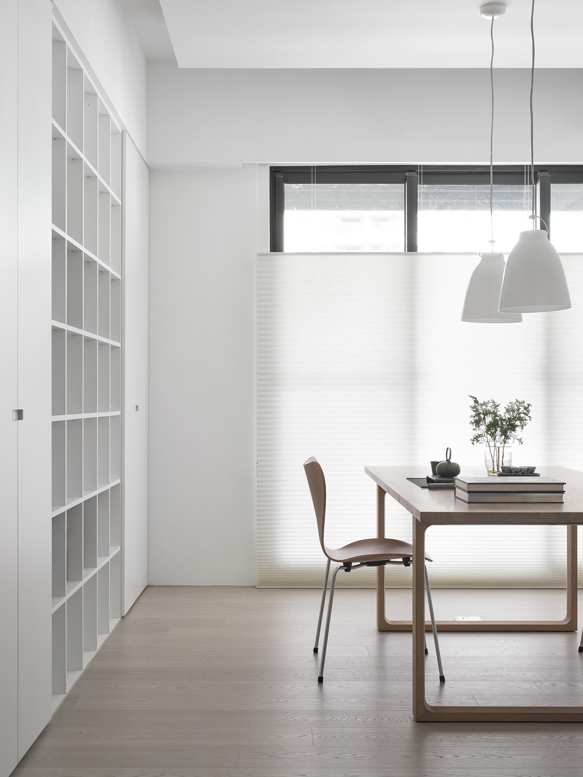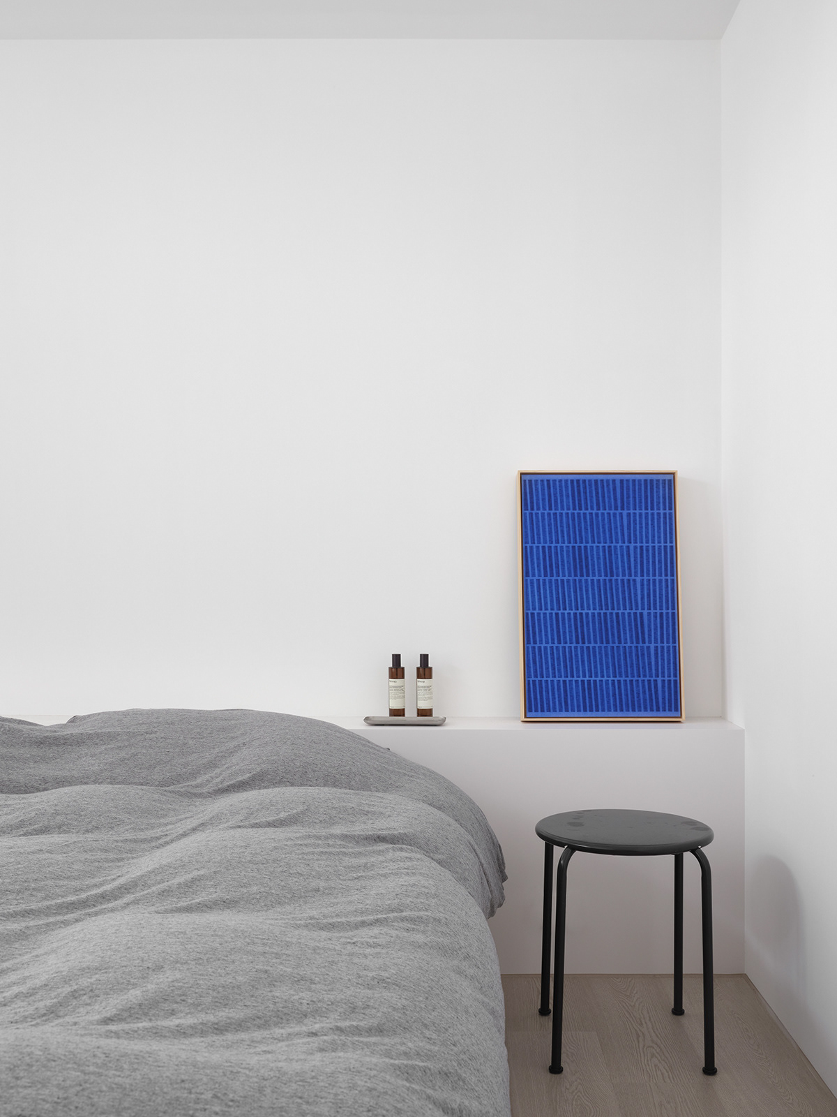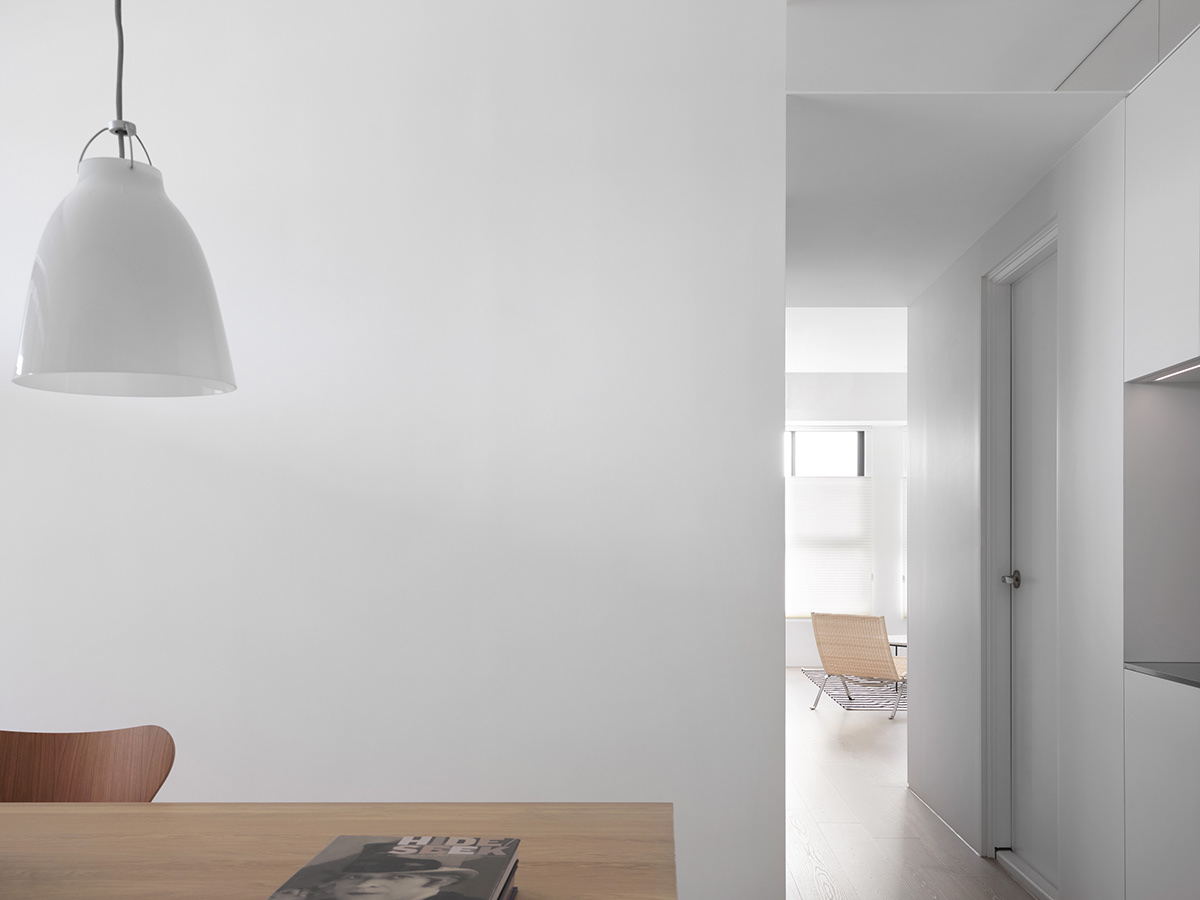 • 卧室:整面墙的白色收纳柜+隐形门设计,把“极简”贯彻到底,浅灰床品让空间更显松弛。