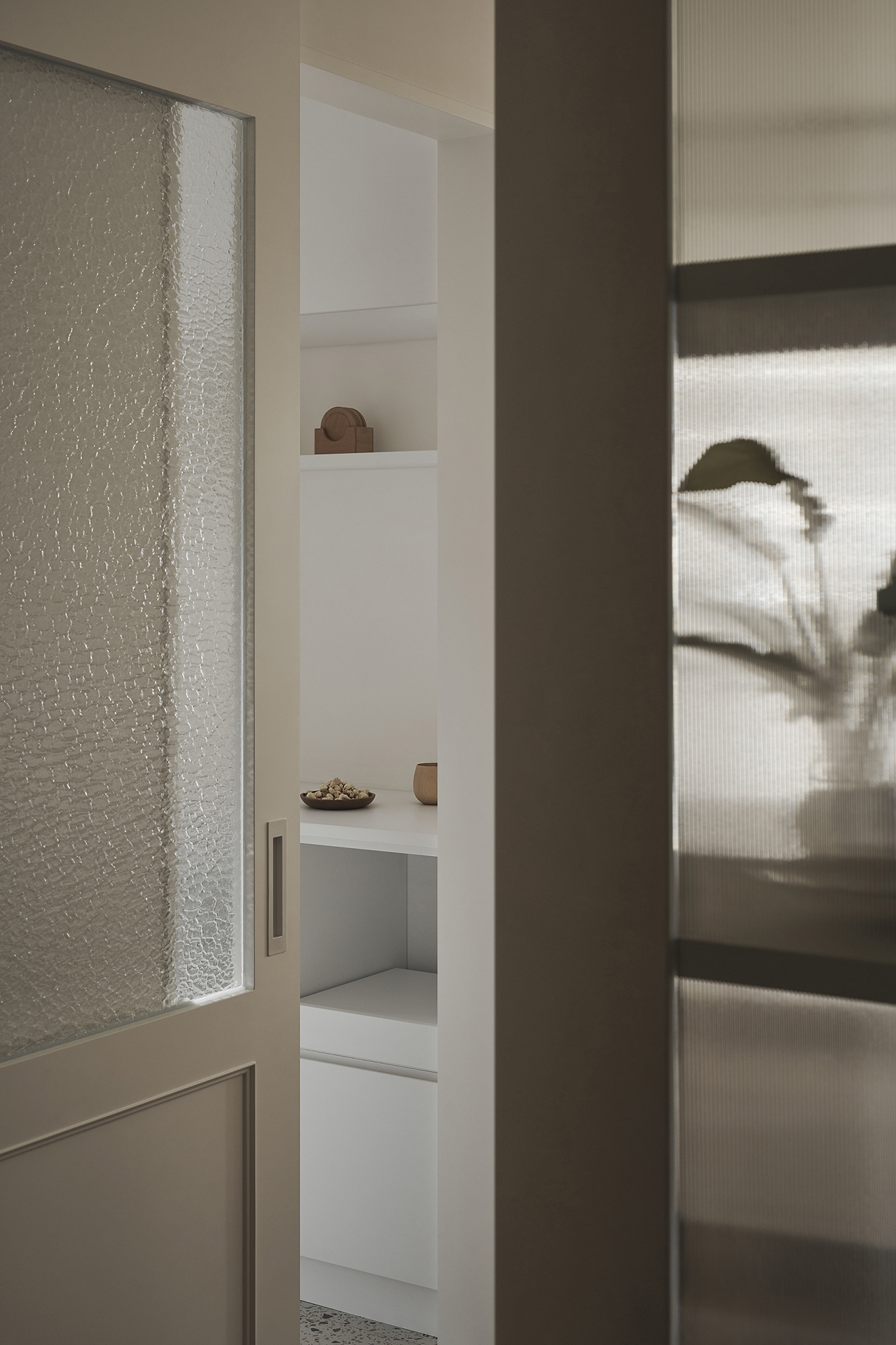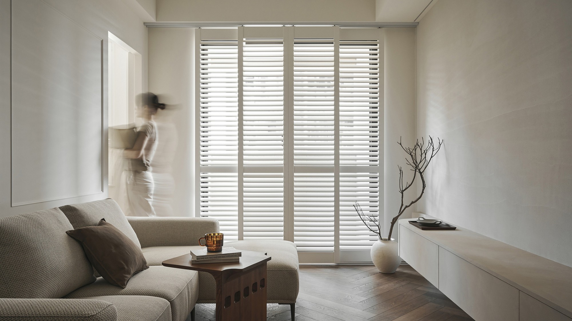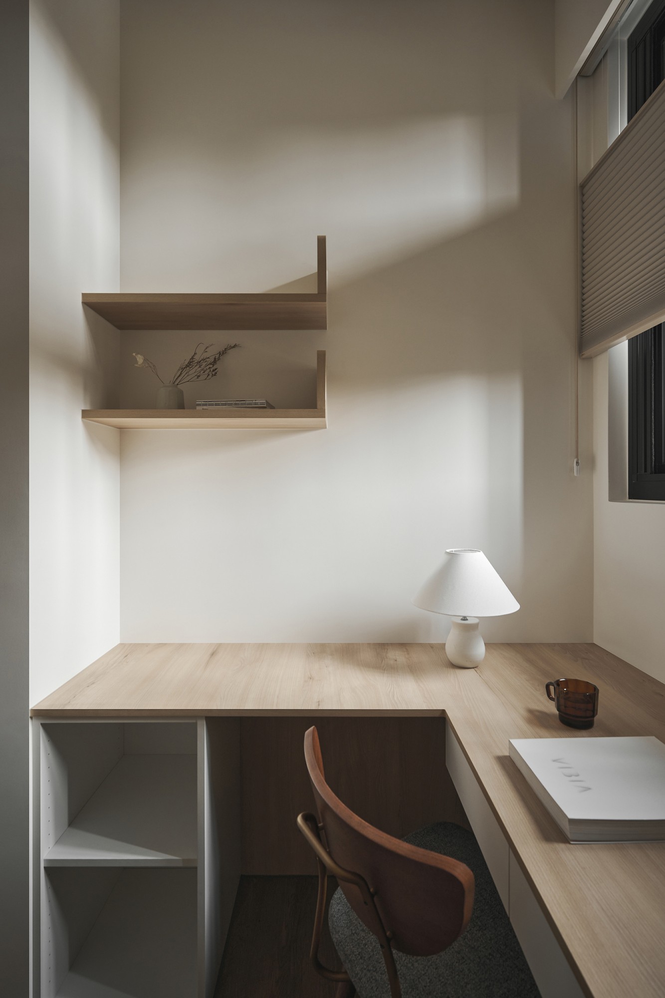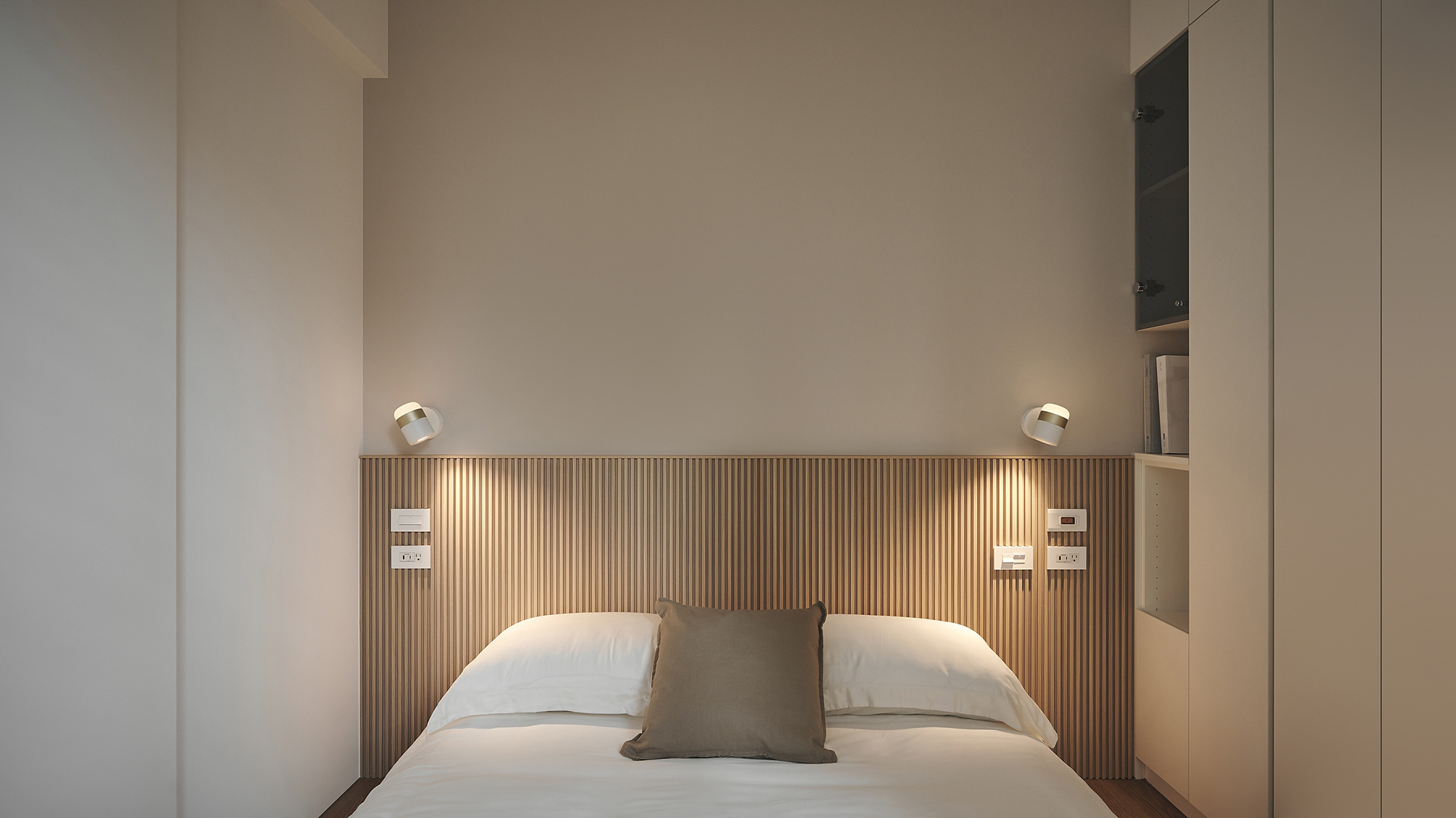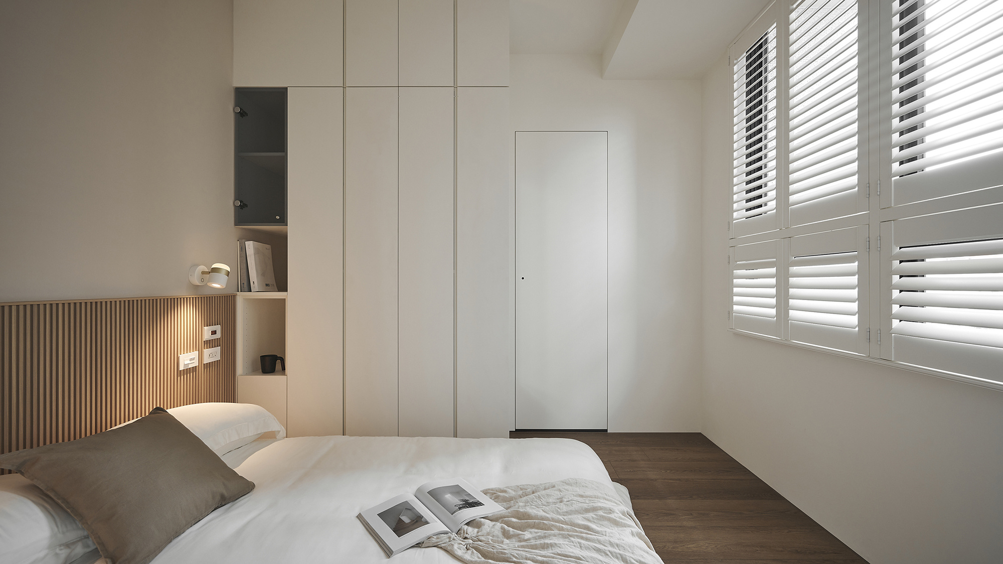 整面定制柜+隐形门设计,最大化利用空间;局部木质格栅床头+嵌入式灯光,在极简中增加温馨细节,百叶窗保证隐私同时引入自然光。