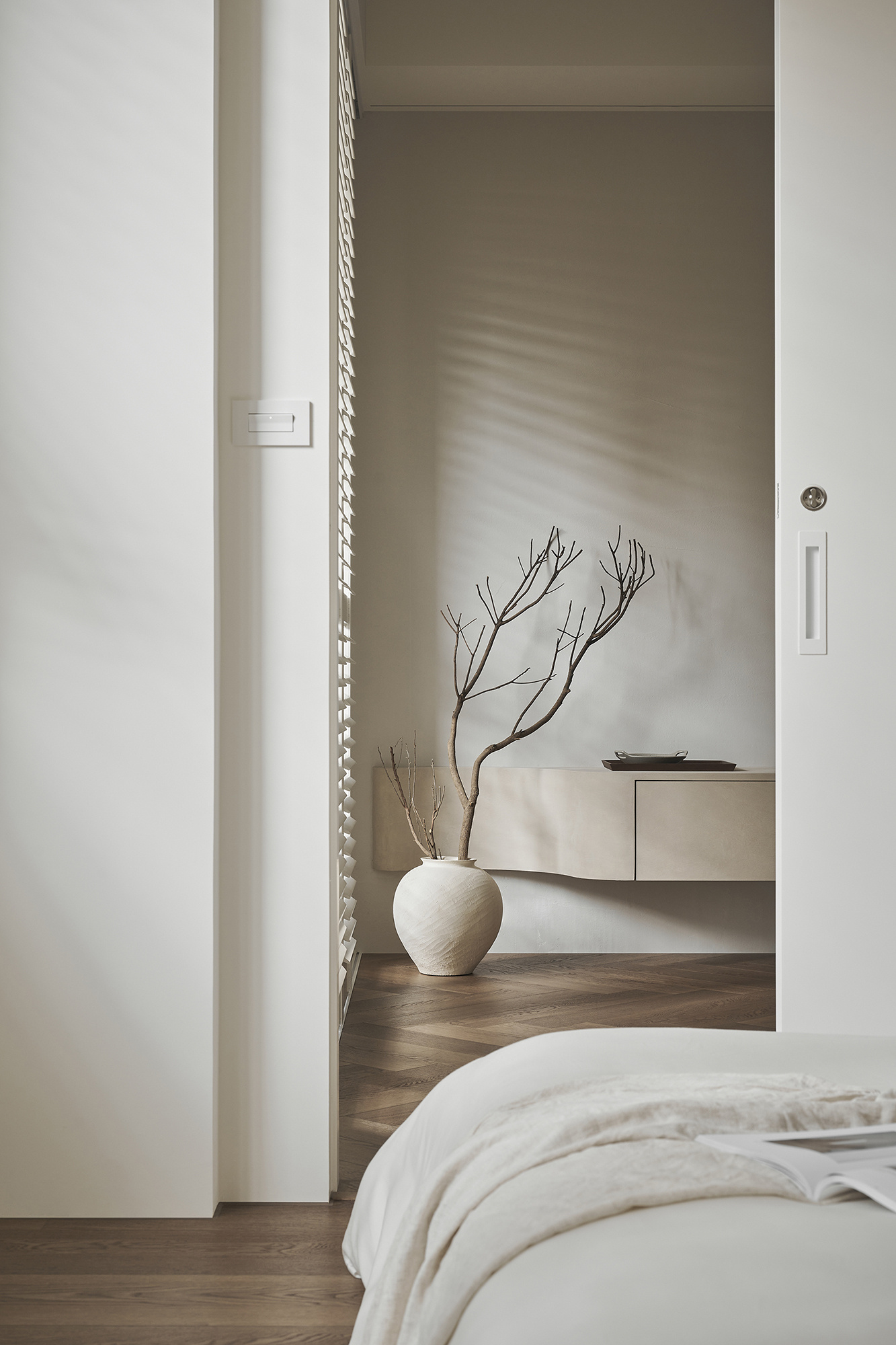 浅肌理墙面+人字拼木地板,搭配低饱和布艺沙发,弱化硬质线条; 通顶百叶窗柔化光线,局部置物柜+枯枝装饰平衡简约与温度。