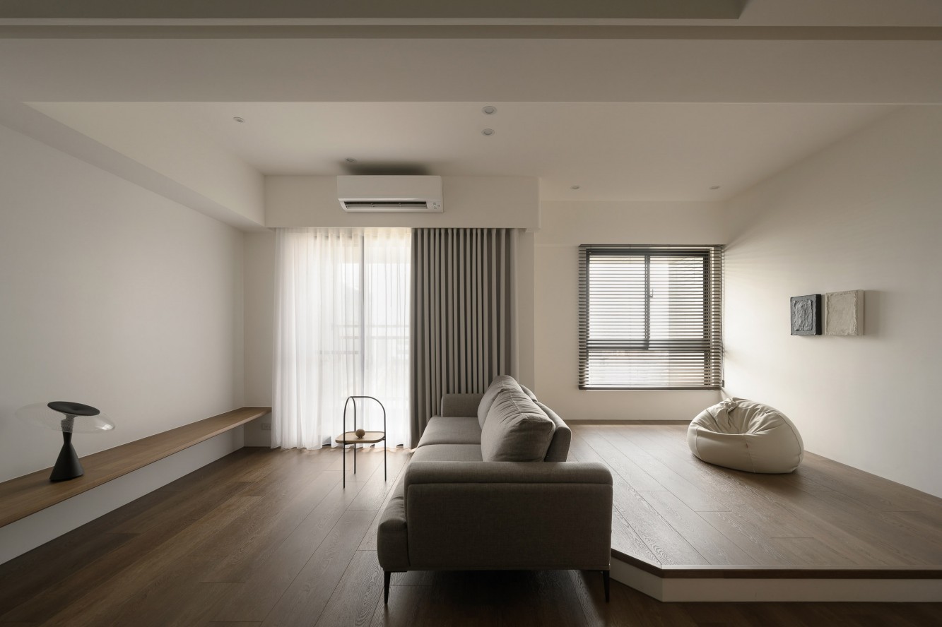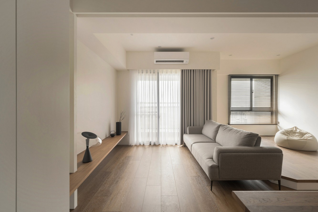 • 客厅:浅褐木纹悬浮柜衬着麻灰沙发,纱帘+百叶窗让光线“软着陆”,豆袋椅往角落一丢,随手就能陷进松弛里。