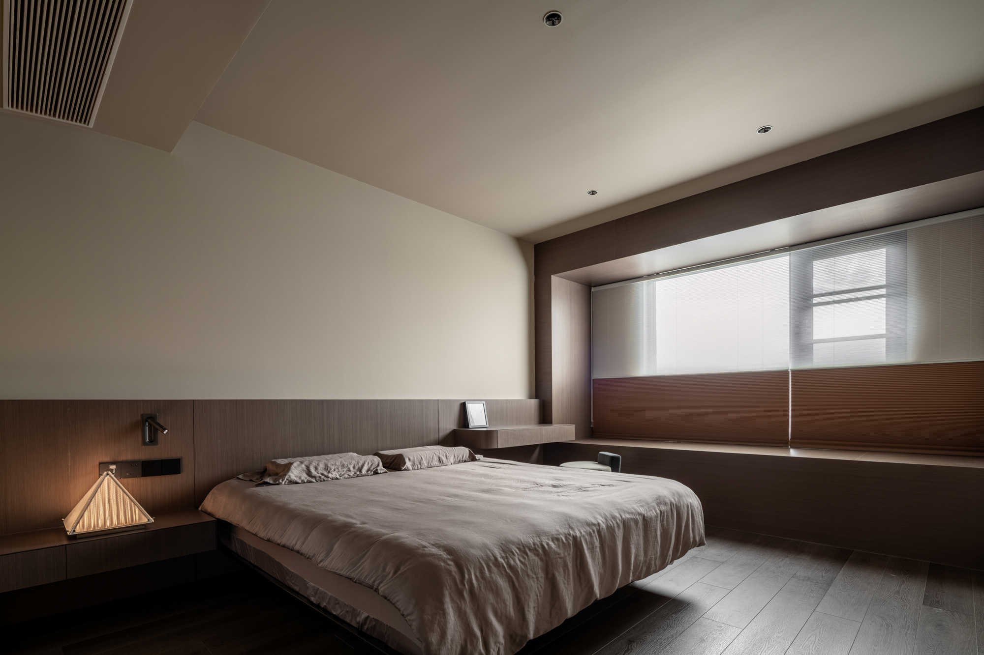 • 卧室:木饰面床头+悬浮台面,把收纳藏进简约里;百叶窗滤进的柔光,裹着浅褐床品,睡进松弛的温柔里。