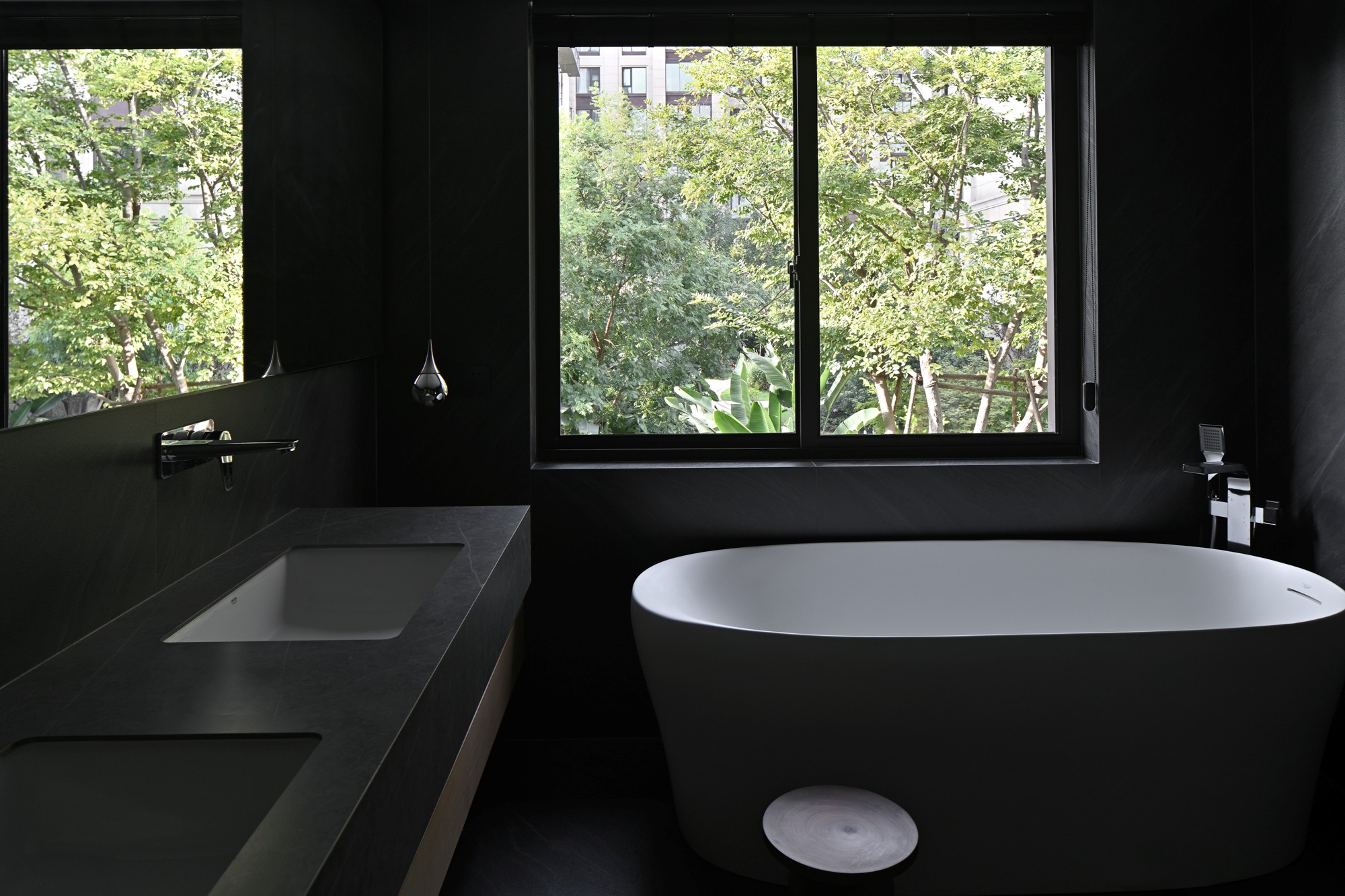 • 主调是深黑哑光石材,却靠“窗外绿意”打破了沉闷:大窗直接框住户外的树,泡澡时像坐在森林里;