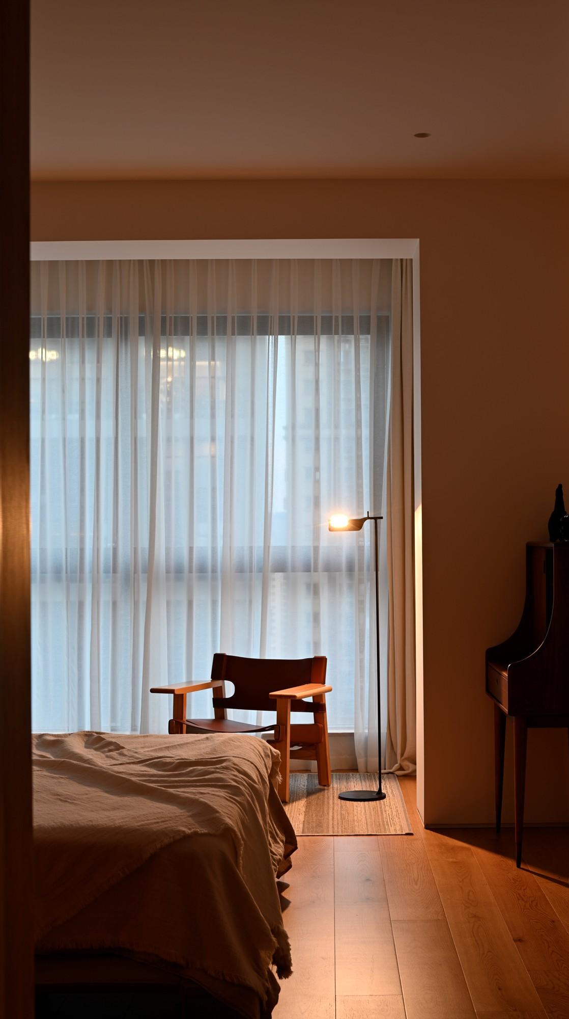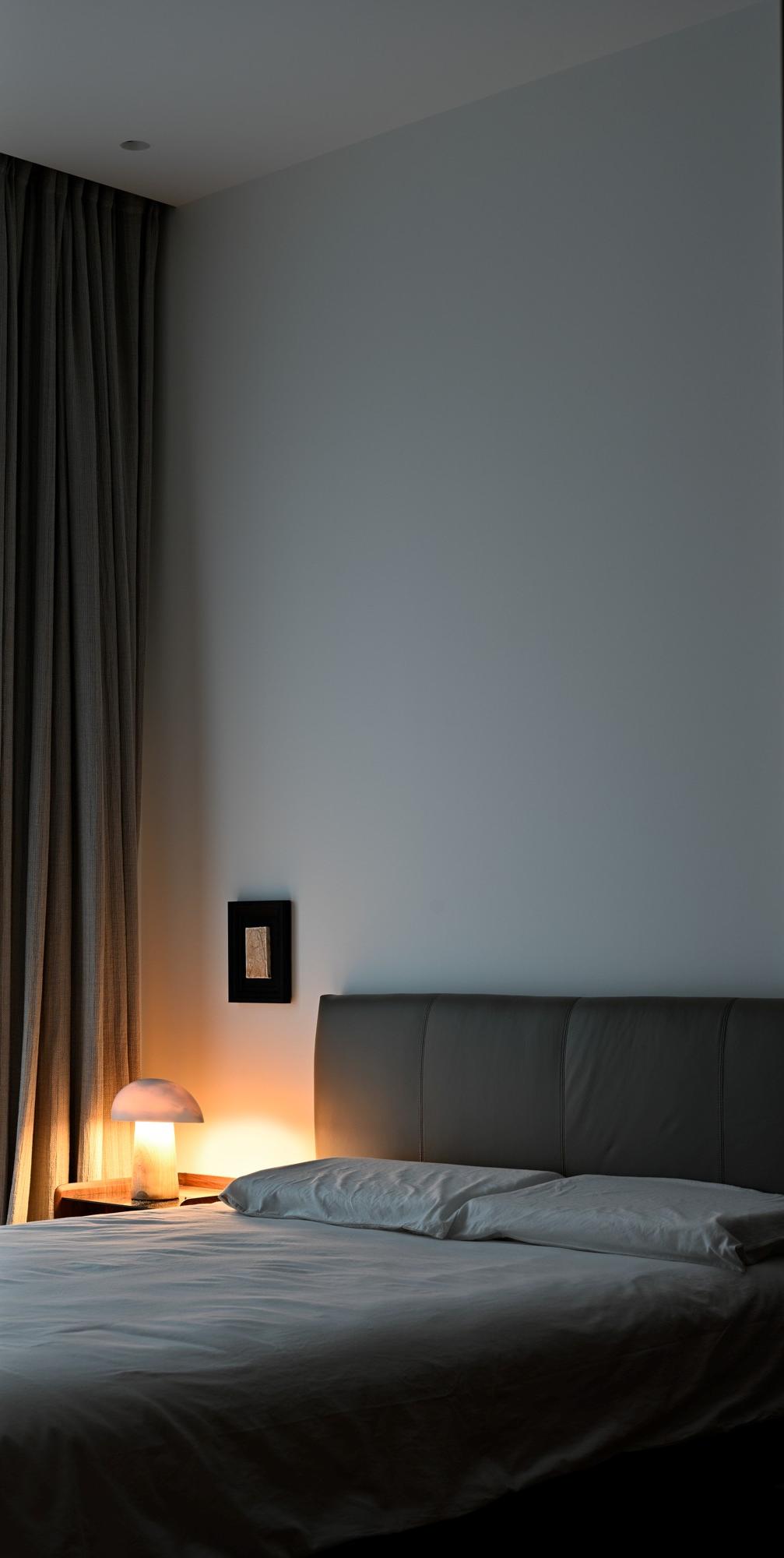 • 细节很温柔:褶皱感的床品(比平整的更有生活气)、圆润的台灯(暖光刚好落在枕边),连窗帘都是深灰亚麻材质,遮光又柔和,躺下就能放松下来。