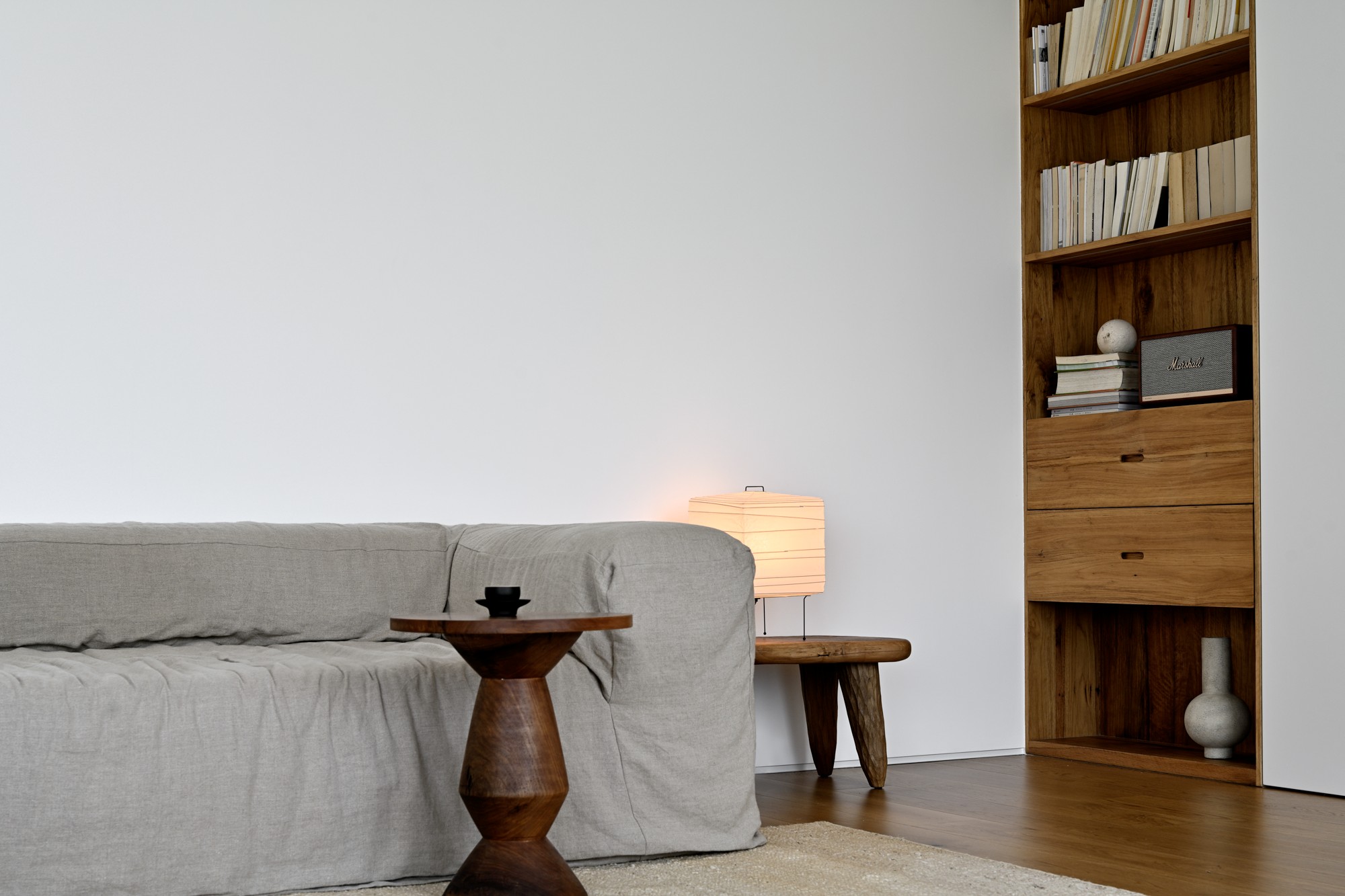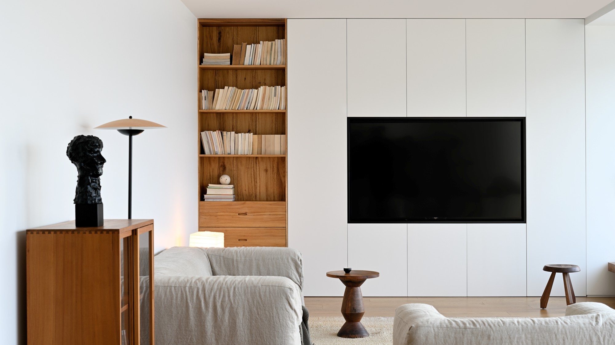 • 细节很松弛:褶皱感的亚麻沙发(软到想陷进去)、异形木质小边几(自带艺术感),连台灯的光影都刚好落在雕塑上,温柔又有质感。