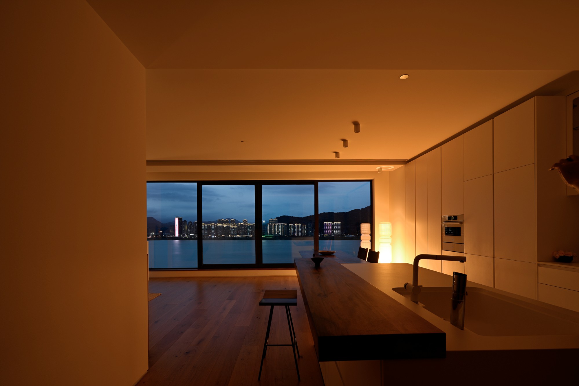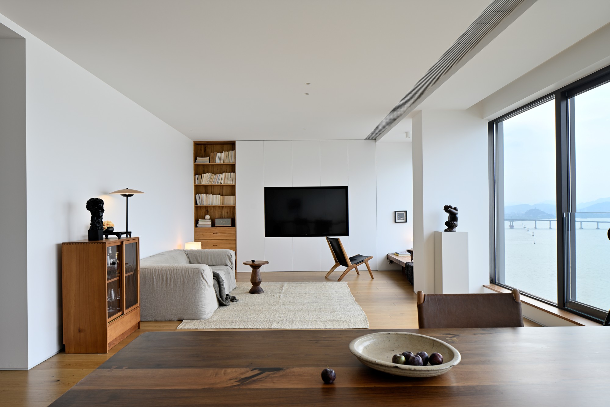 整个空间的妙处在于:用“原木暖调”当生活底色,用“极简白墙”做干净框架,再用“窗外江景+自然肌理”当调味剂,既有极简的利落,又有被自然包裹的松弛感。