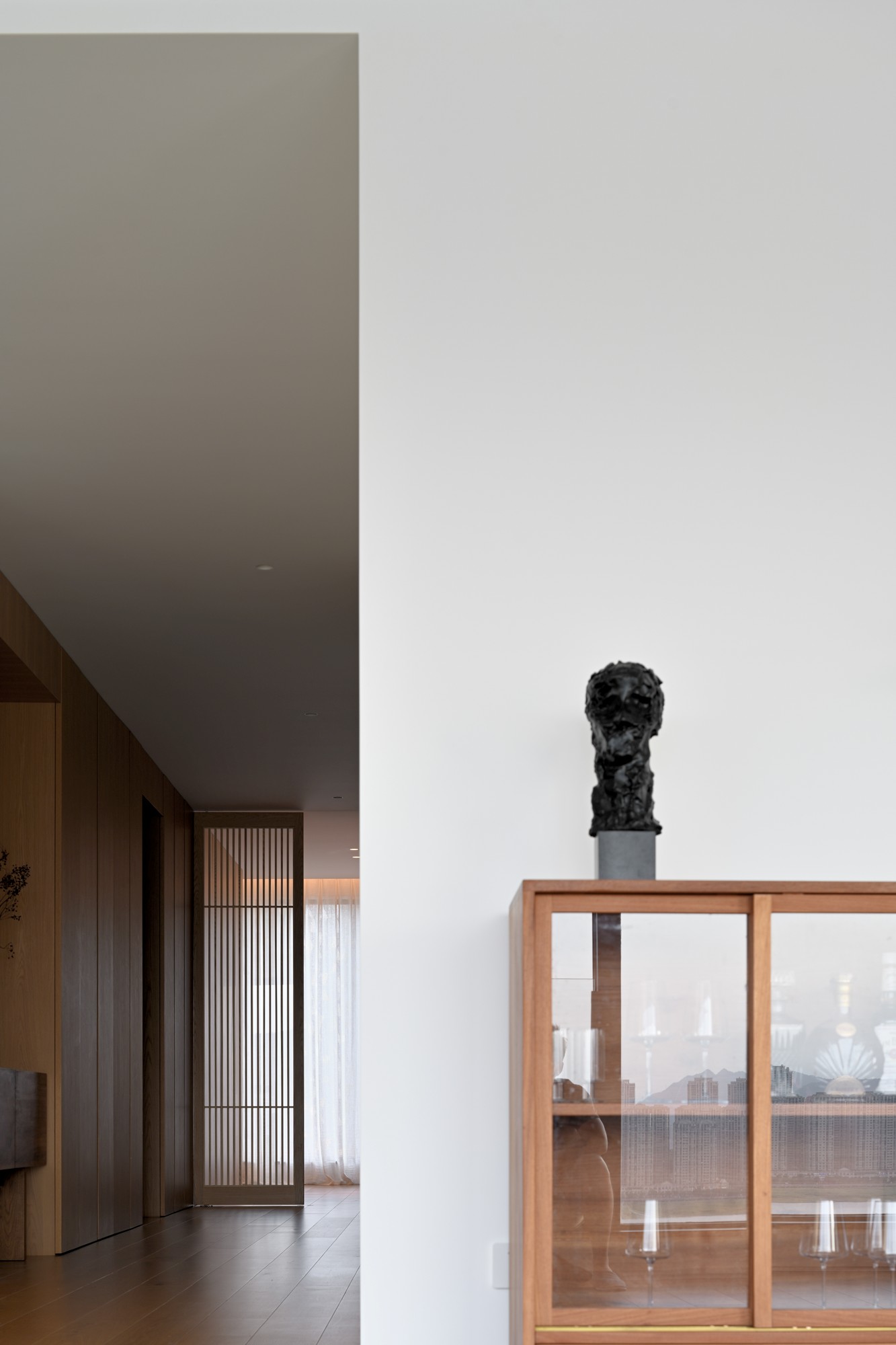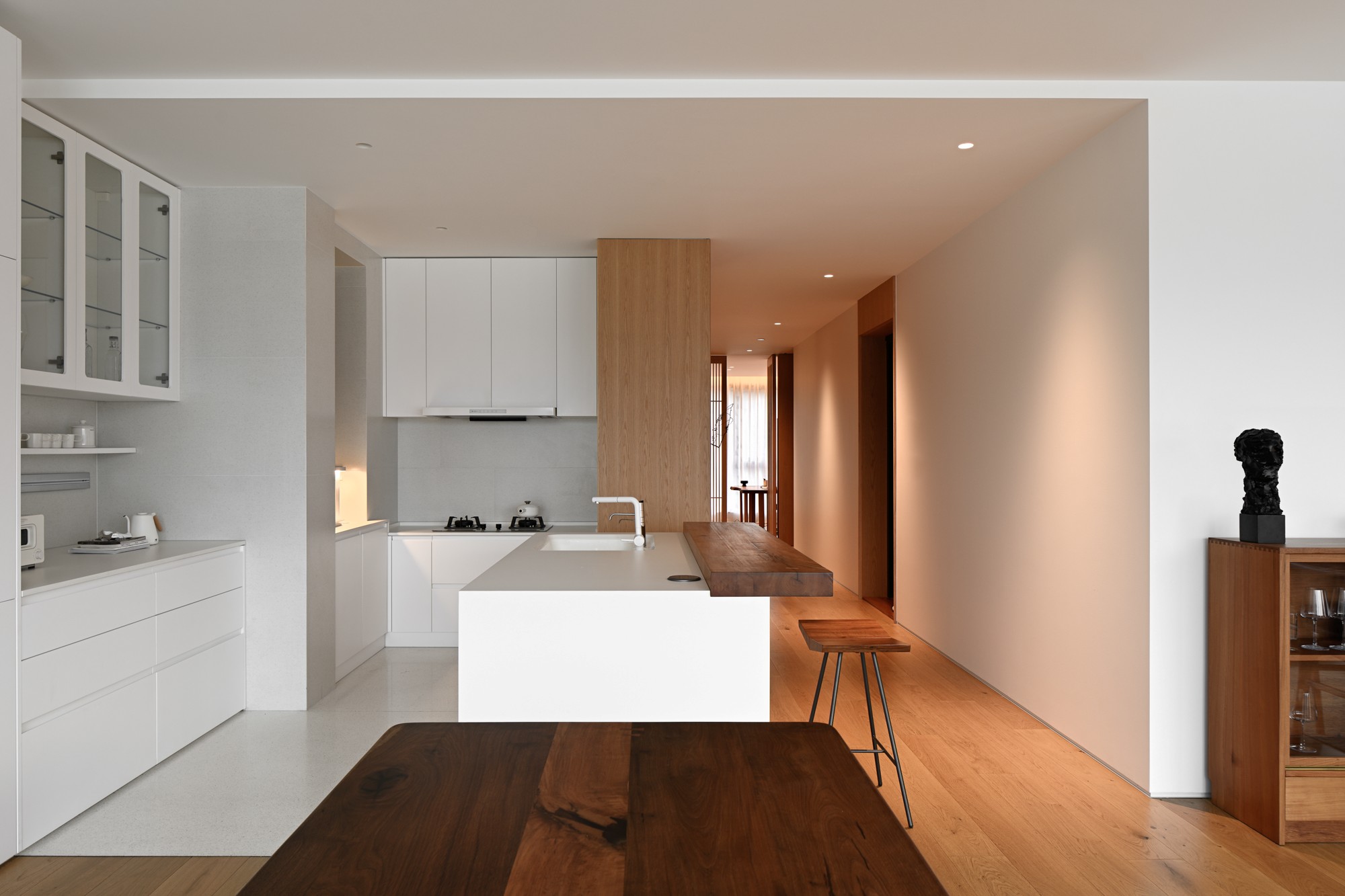 • 光影很巧妙:走廊的暖光透过木柱洒进来,让冷调厨房多了点生活的温度。