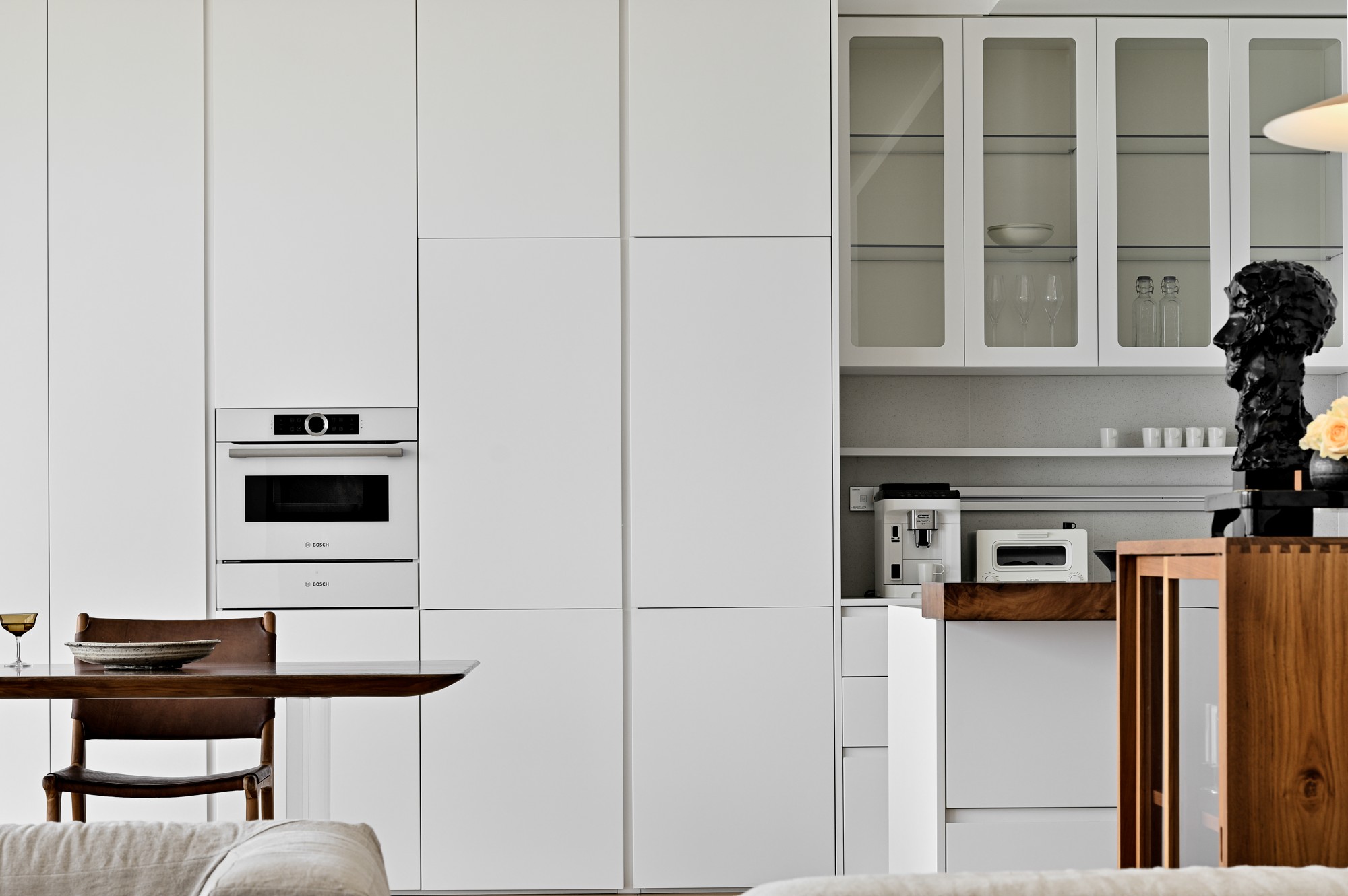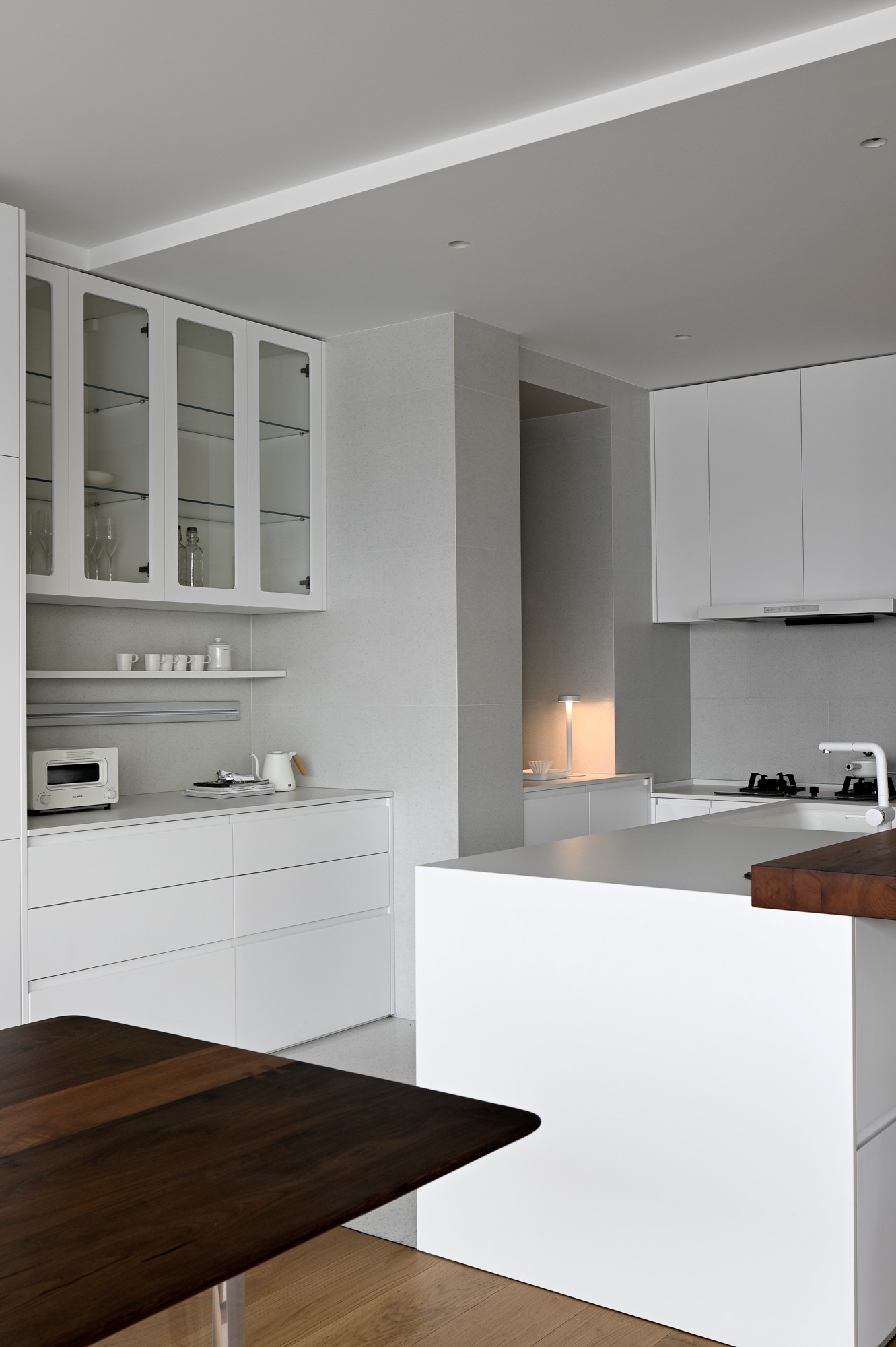 • 空间是“白柜+浅灰墙”的极简基底,却靠原木岛台添了暖意;