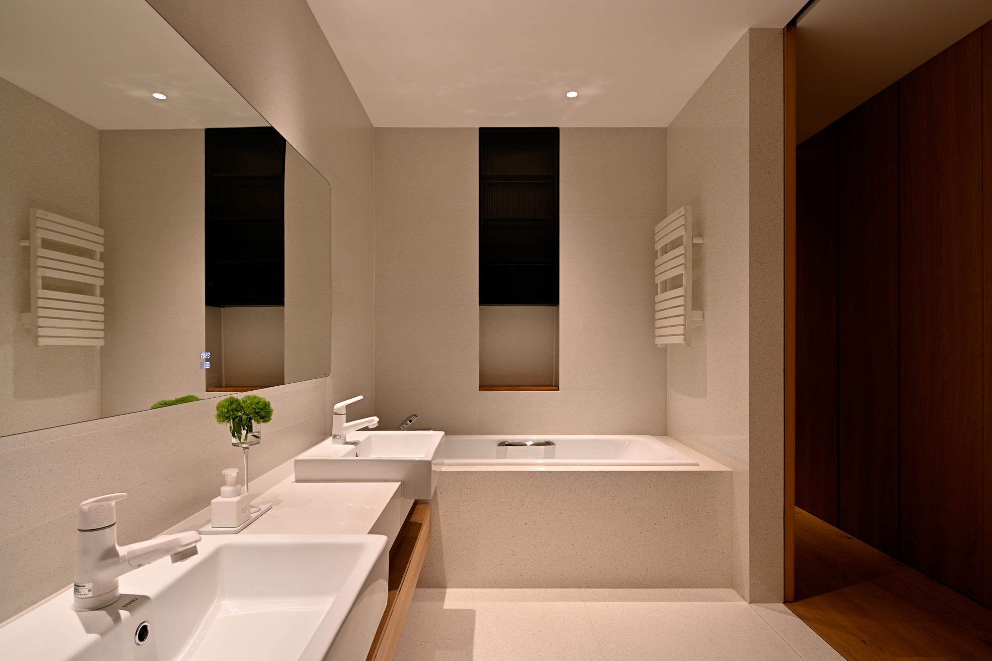 • 实用又高级:双台盆设计(早上不用抢洗手池)、悬浮原木柜(藏起杂物还显轻盈),浴缸边的墙面延续了水磨石质感,泡澡时像泡在“自然里”;