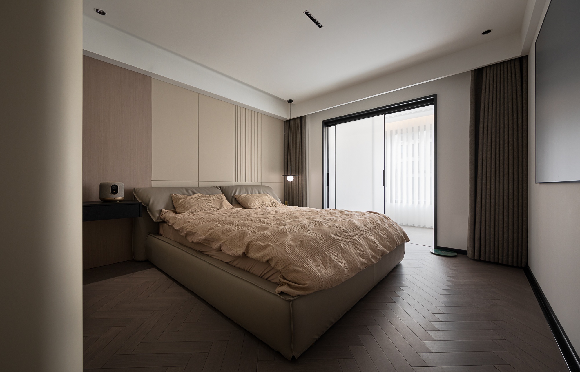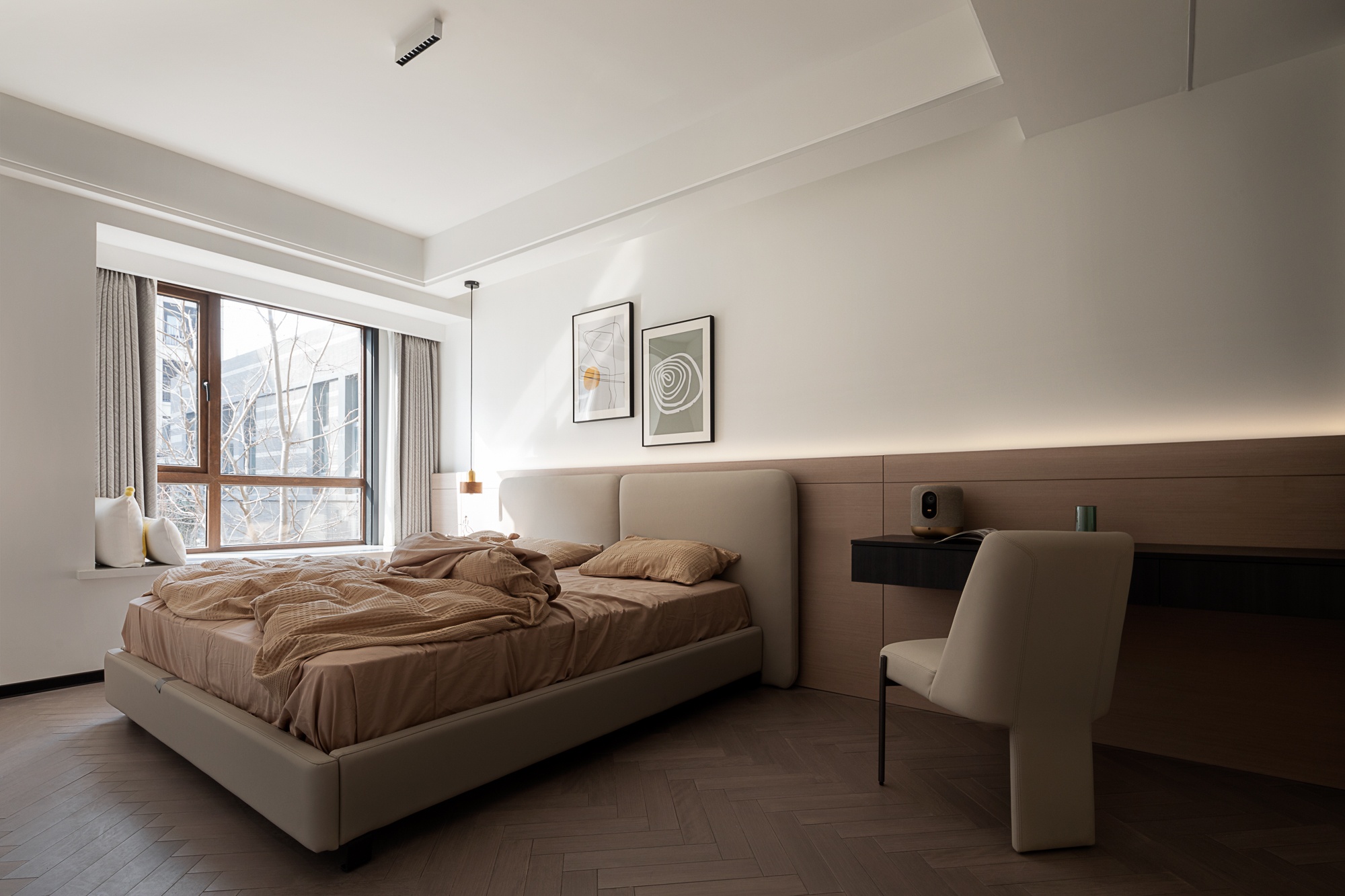 • 卧室:人字拼木地板+暖棕床品,床头的木质护墙与隐藏式书桌一体设计,灯光用线性灯带+小吊灯营造温馨感,把舒适与实用无缝衔接。
