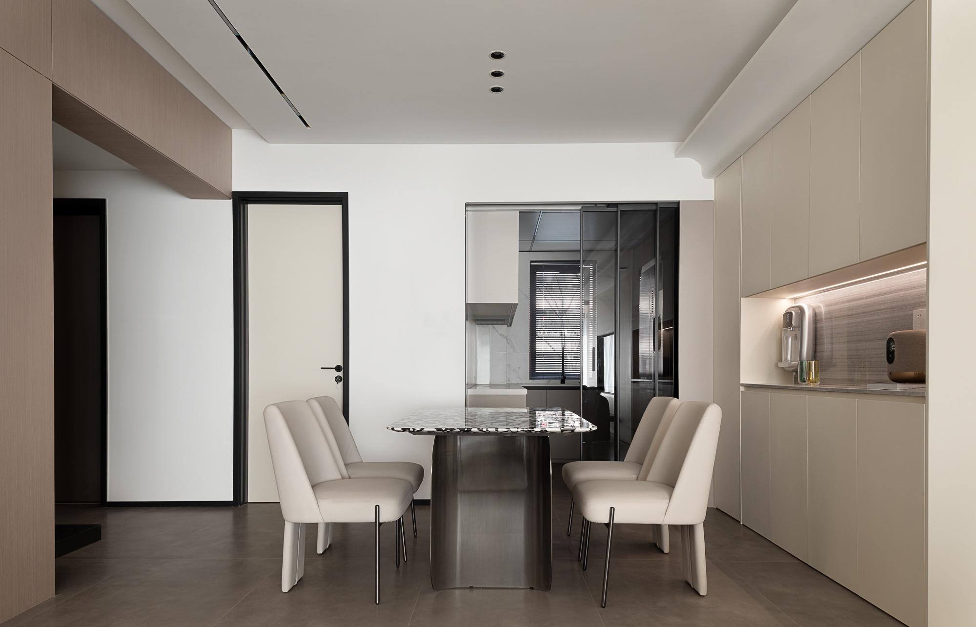 • 餐厨区:岩板餐桌+同色系餐椅简约利落,玻璃移门让厨房与餐厅视觉连通,隐藏式柜面+嵌入式家电,把实用功能藏进极简美学里。