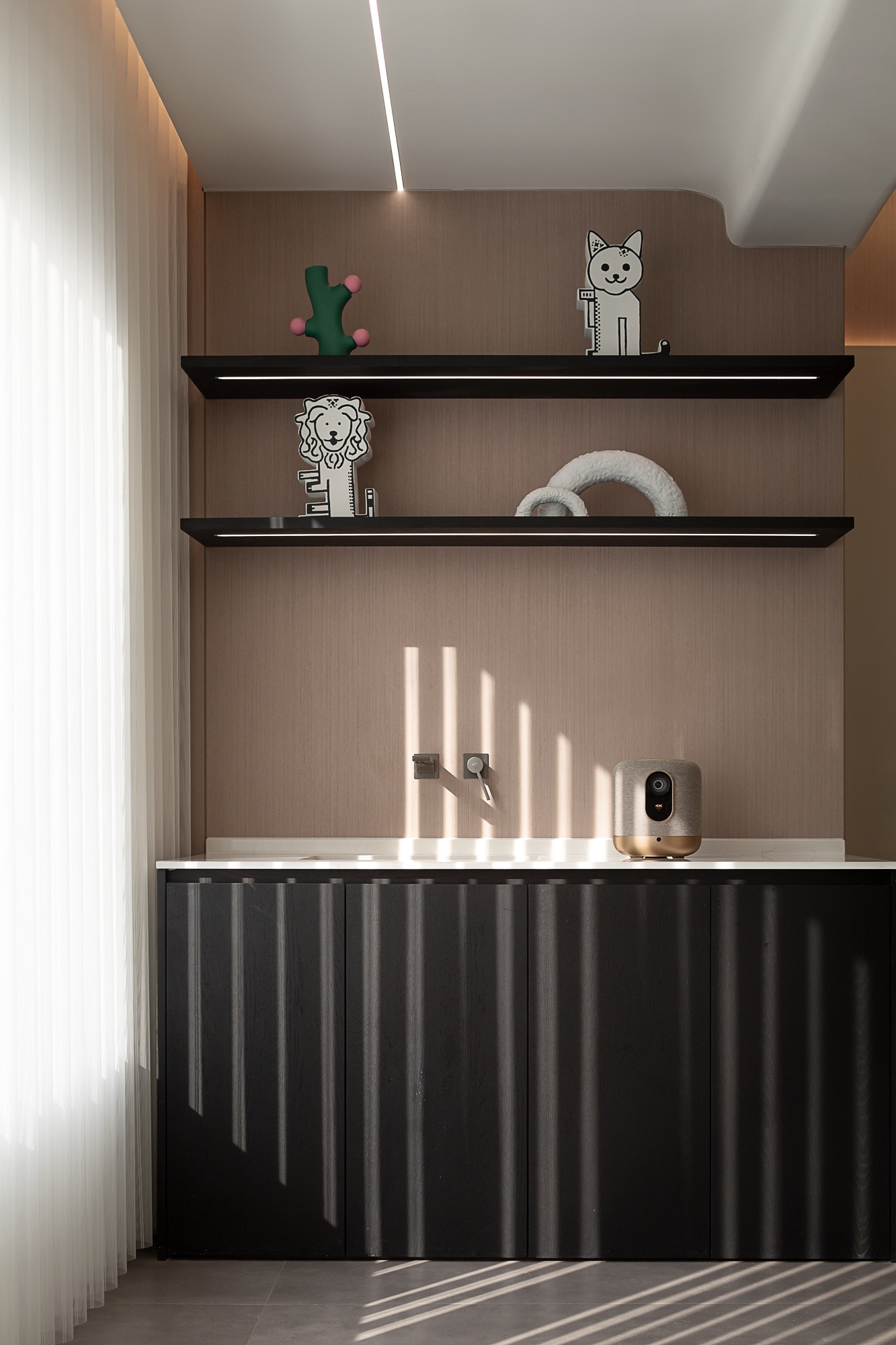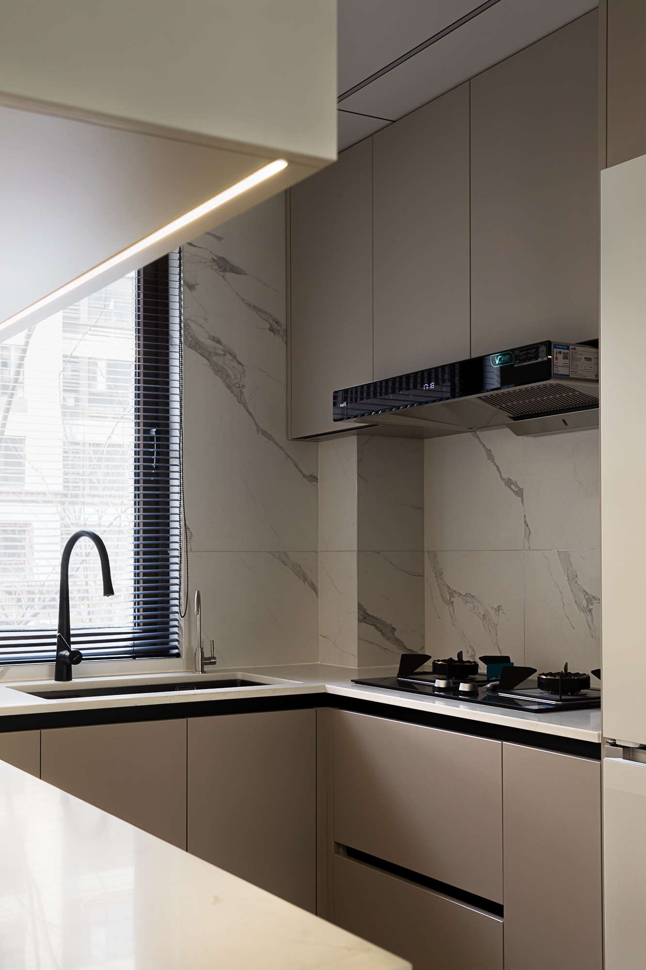 • 厨房:灰白大理石纹墙面+浅咖柜面,线条利落的黑金色厨电点缀其中,既保持了整体的柔和感,又用细节提升精致度。