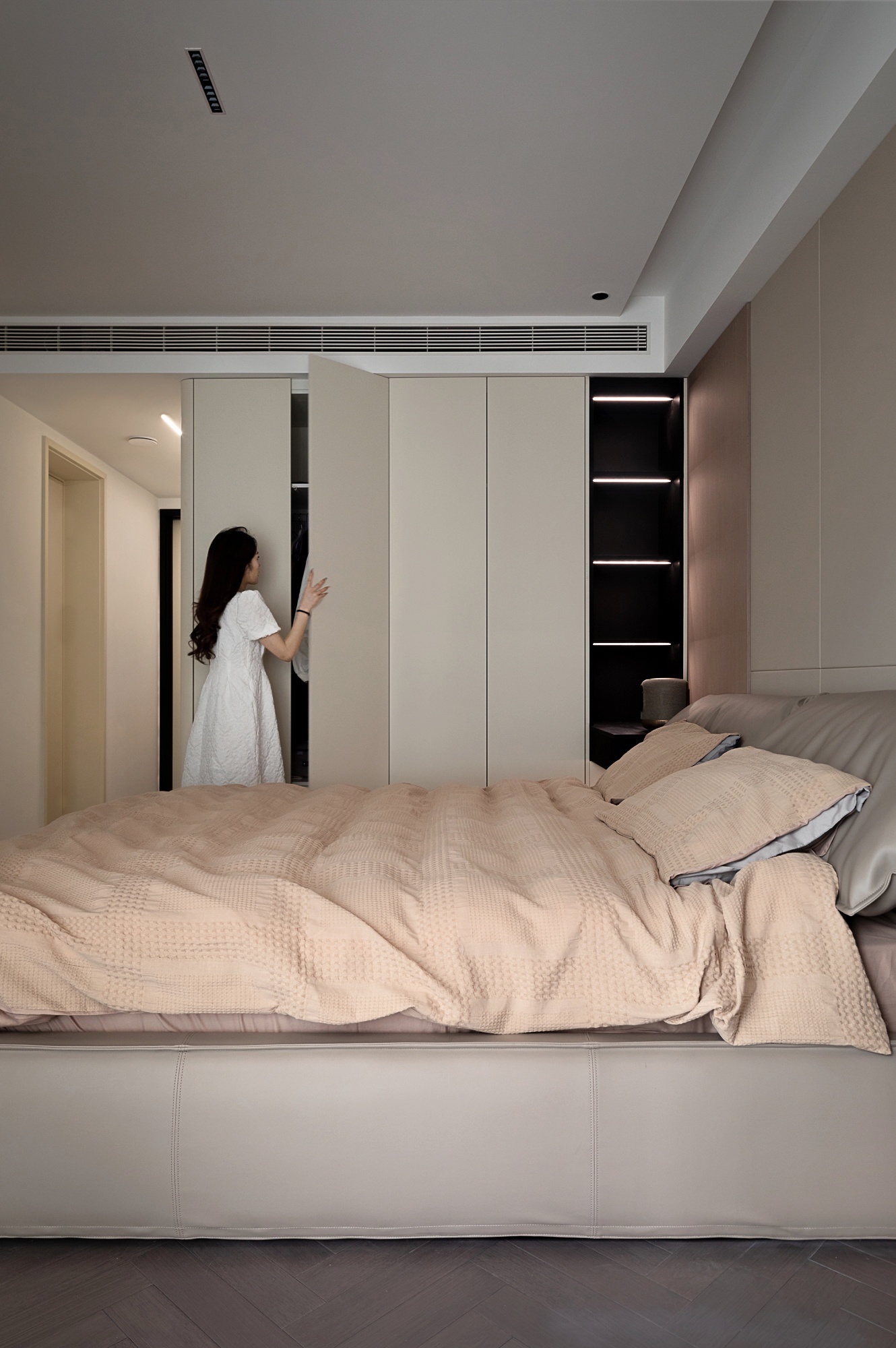 这套住宅是现代简约与柔和质感的融合,用低饱和度的暖调色系+自然材质,打造出松弛又高级的居住氛围。