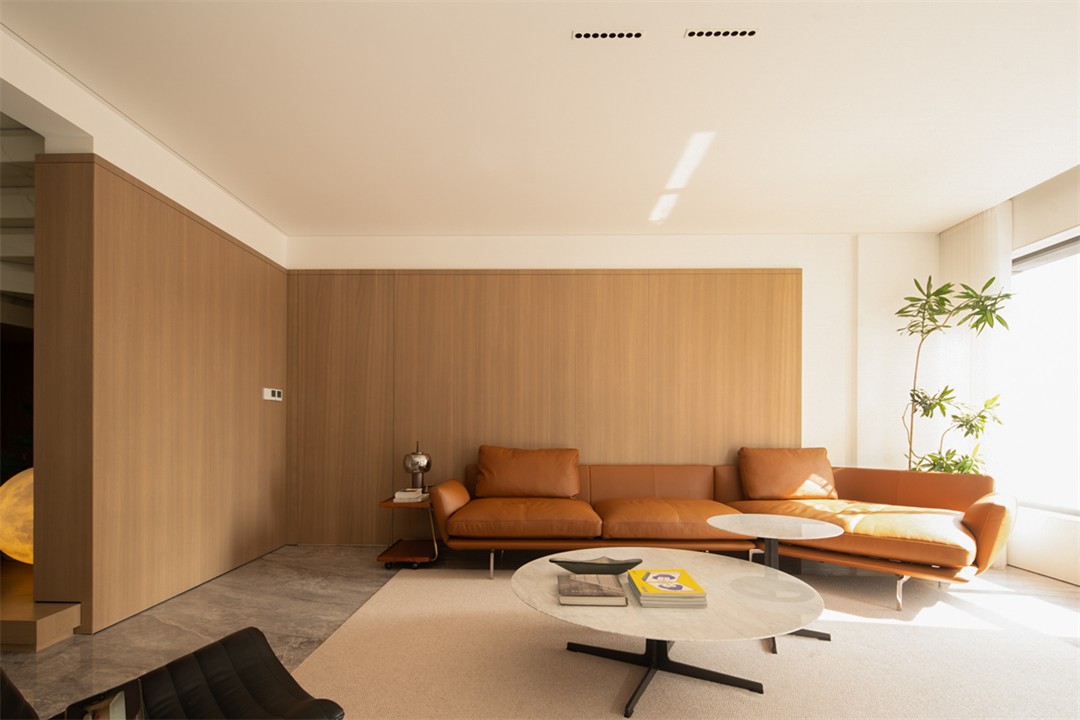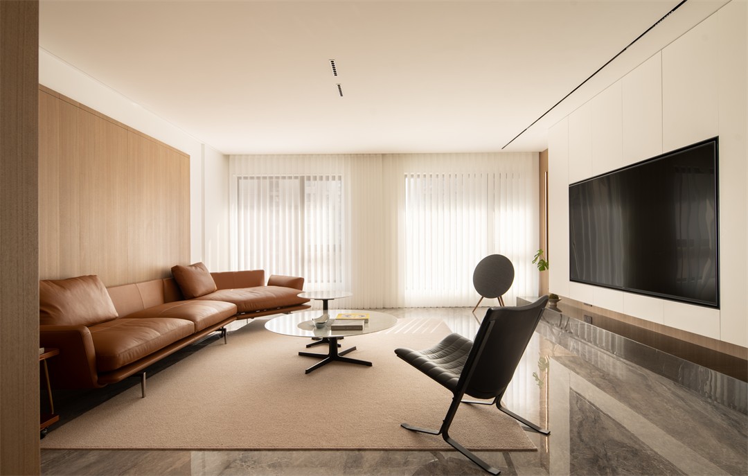 浅木纹理包裹墙面,消解了空间的冷硬;焦糖棕皮质沙发带着慵懒的松弛感,却以利落的线条守住极简调性;黑色单椅的几何骨架、玻璃圆桌的轻盈,让柔和里多了几分“刚”的精致。百叶帘滤过的光线铺在地面,连阴影都成了温柔的装饰。