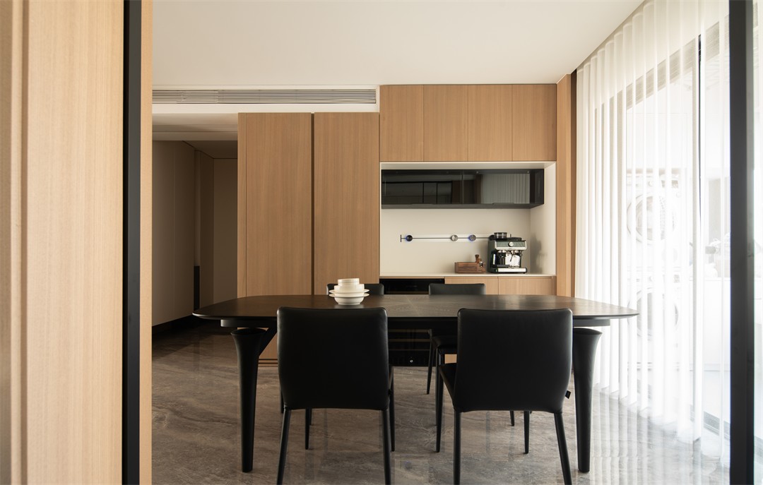 餐厅的黑桌与木色柜体形成冷暖对冲,嵌入式咖啡区把“烟火气”藏进极简界面;厨房以白柜+大理石纹墙打造干净基底,黑色家电线条是低调的质感点缀,开合之间,烹饪的实用与空间的整洁无缝衔接。