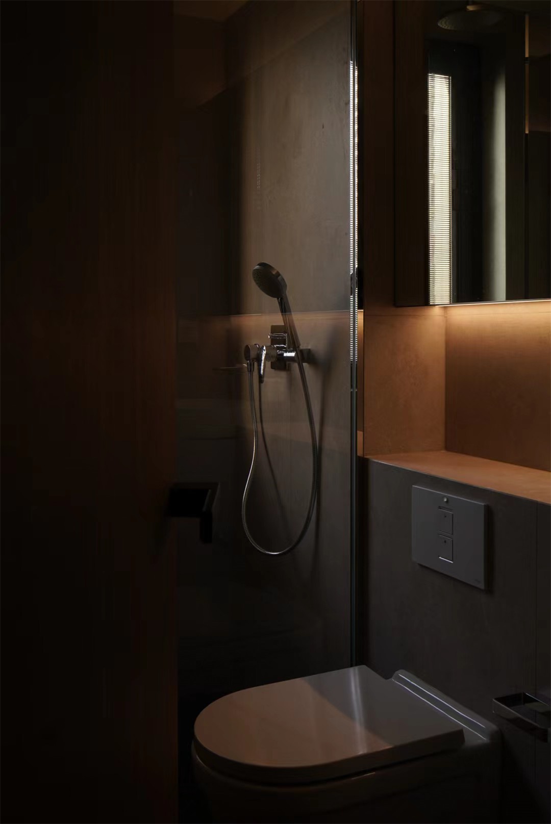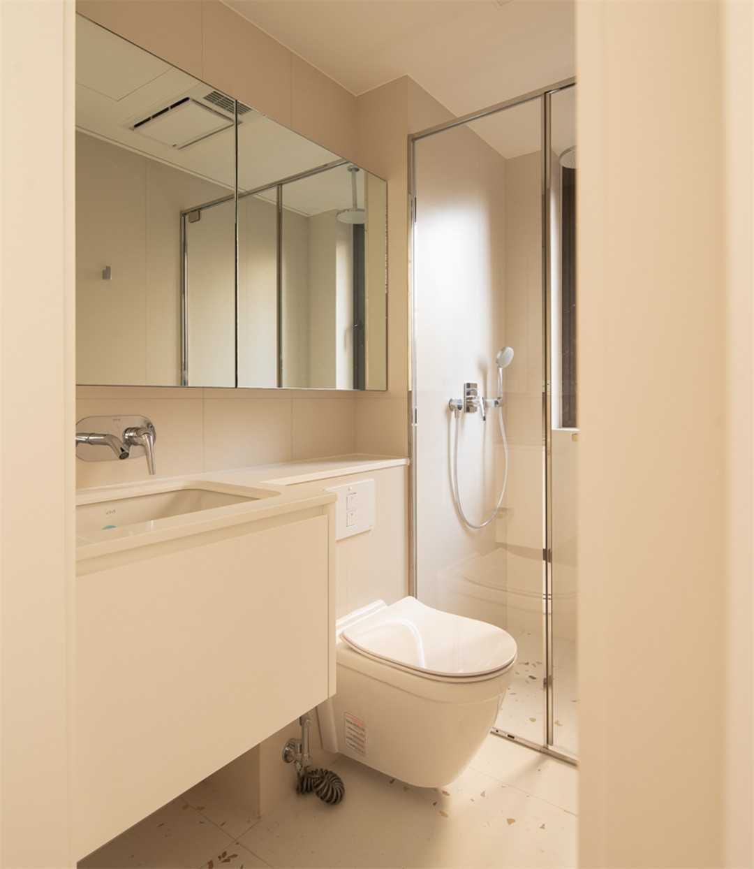 柔和的暖米色铺满空间,镜柜、壁挂台盆最大化释放了整洁感;智能马桶、隐藏式花洒藏起复杂,只留流畅的线条与柔和的光,连角落的细节都写着“舒适”。