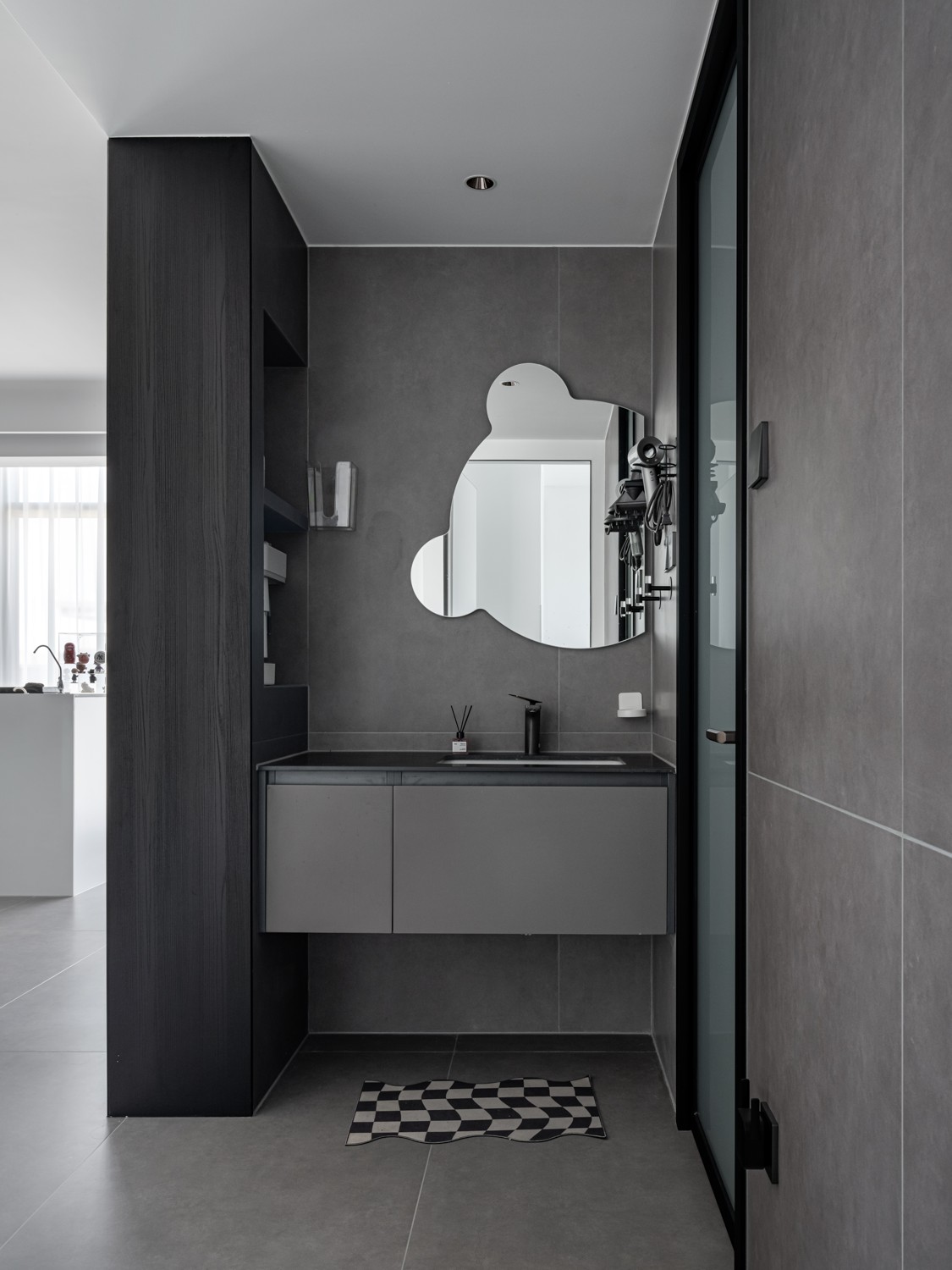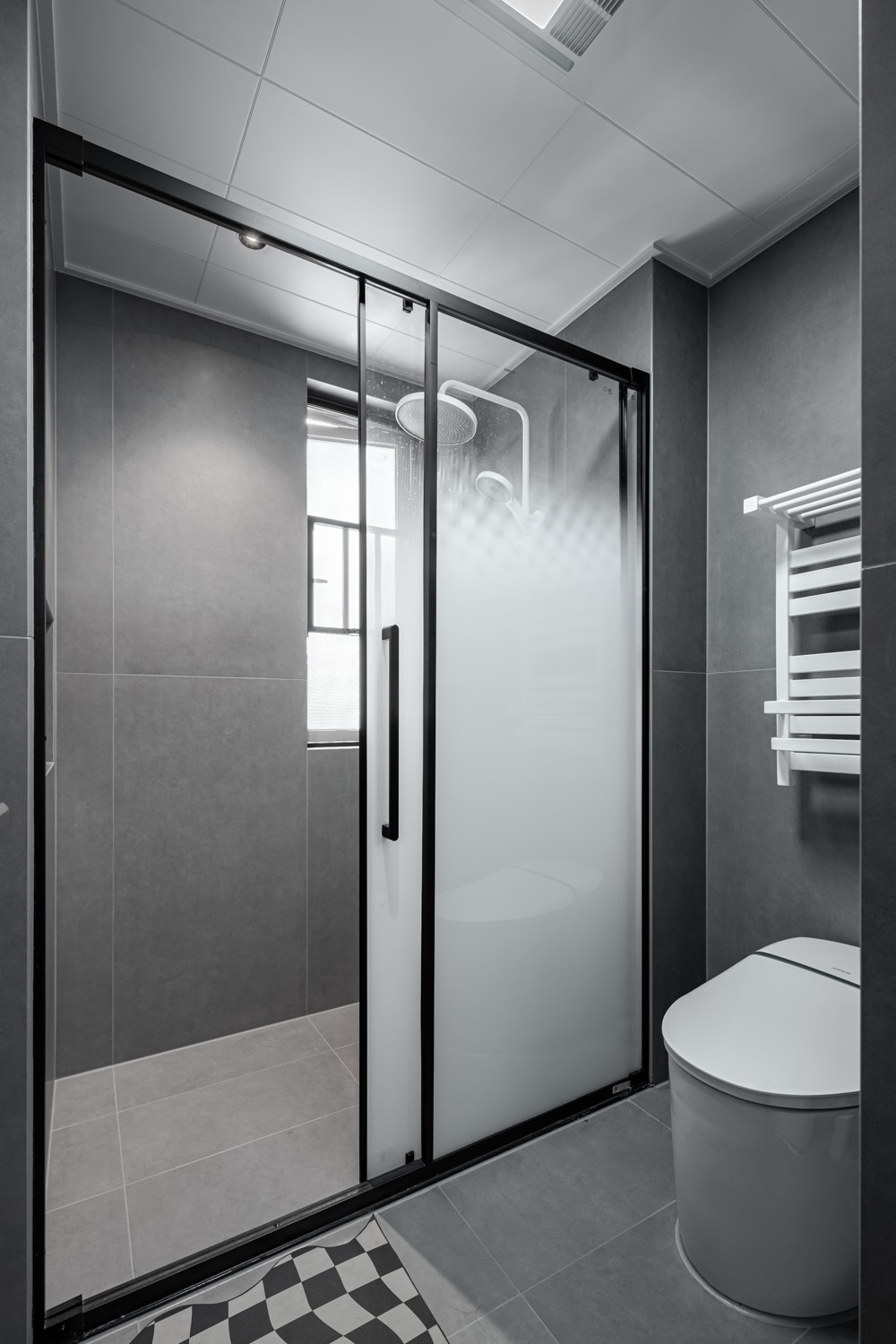 深灰瓷砖+黑框磨砂玻璃,把淋浴区变成“独立结界”,雾面玻璃既挡水汽又透微光。壁挂马桶扫光卫生死角,电热毛巾架是冷调里的“隐形温柔”——连洗漱都成了利落的仪式感。