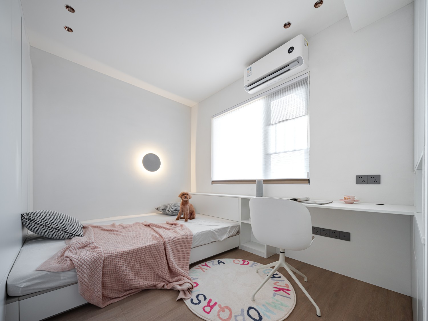 榻榻米+书桌的一体化设计,是“次卧/书房/毛孩子乐园”的三重奏:白天是办公区,铺开电脑就能敲字;晚上铺上粉毯,秒变客卧;连角落的字母地毯,都是宠物的专属“撒欢地”。圆镜壁灯暖光一落,小空间也裹着温柔。